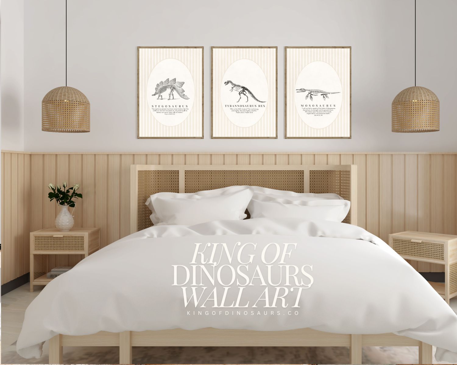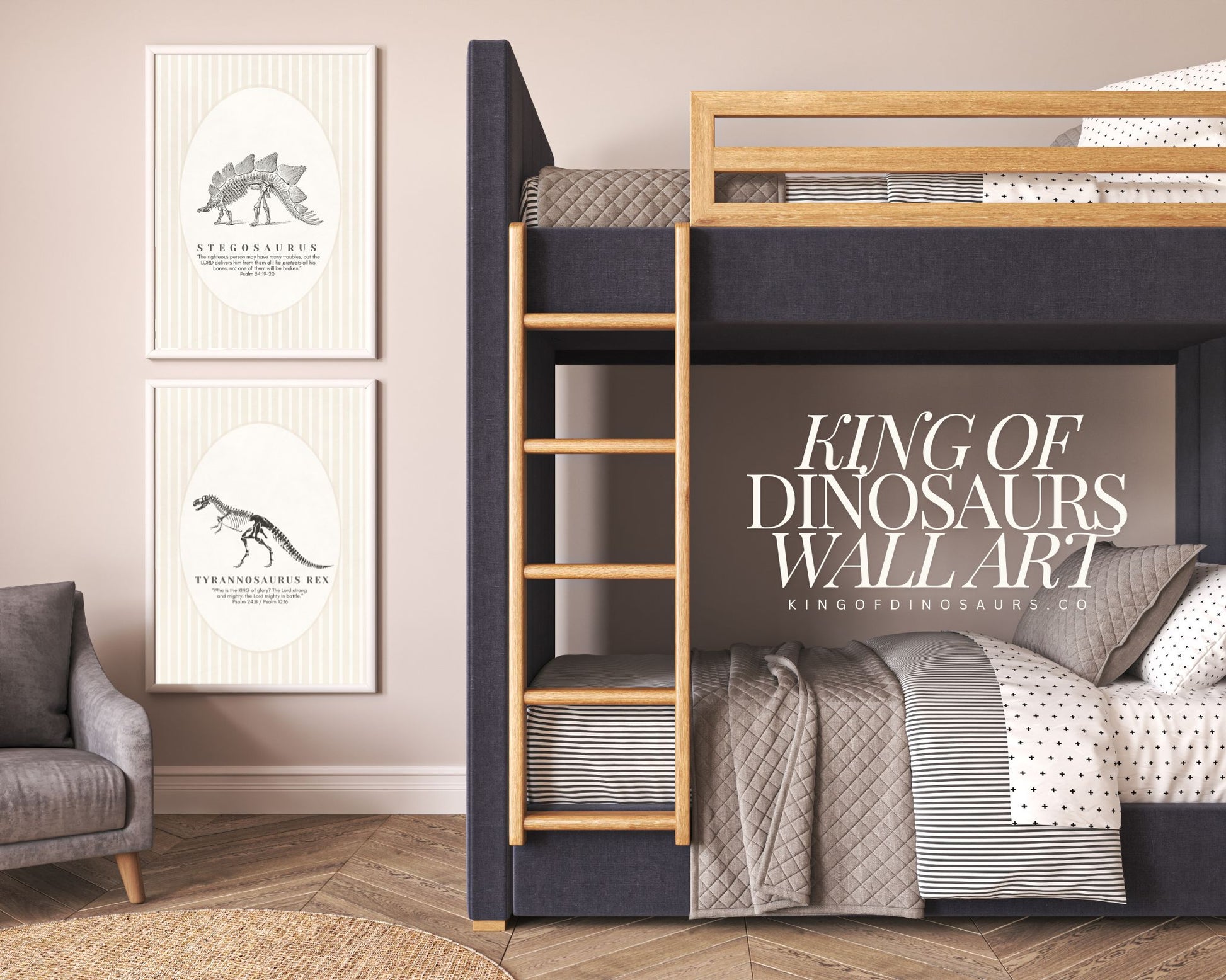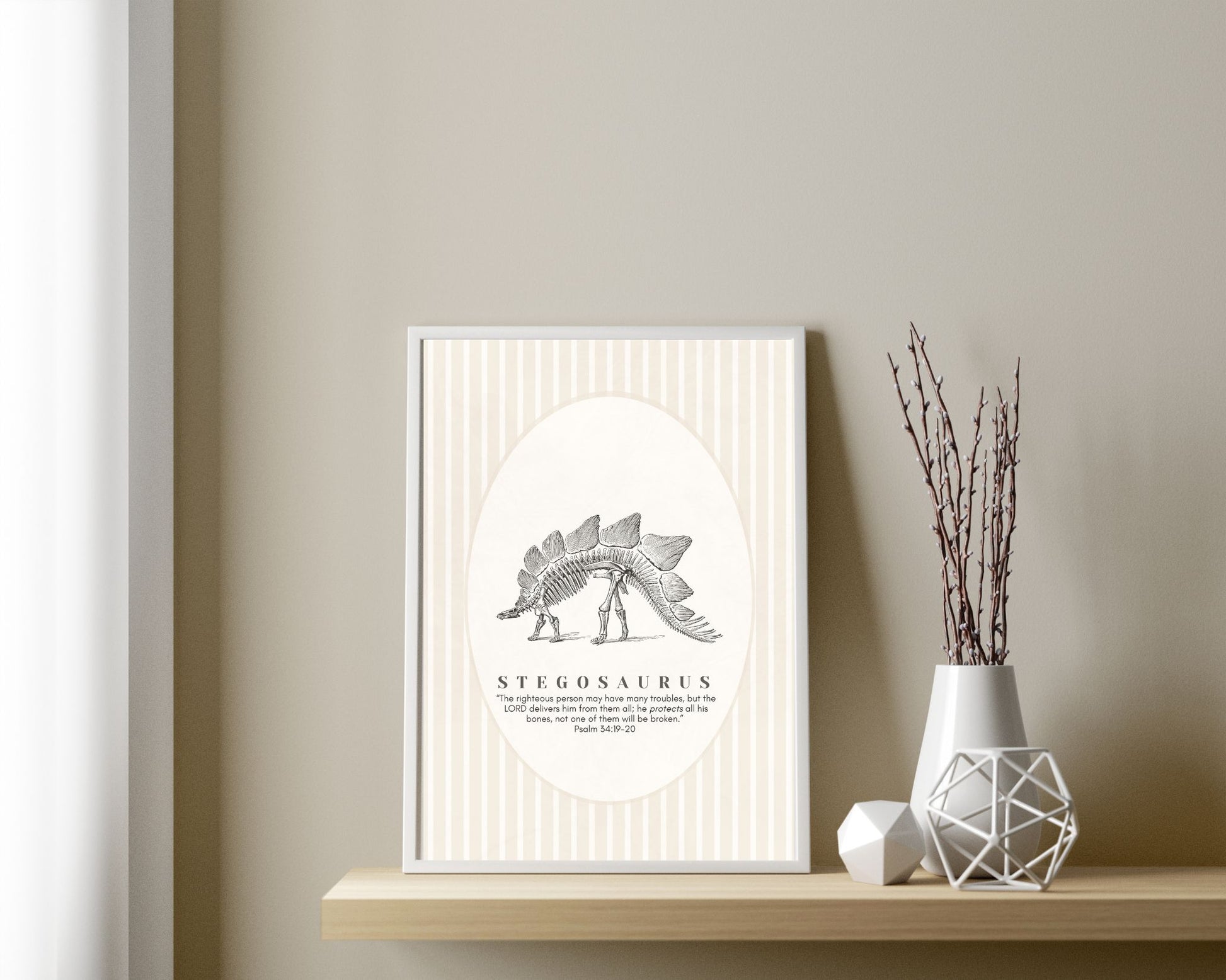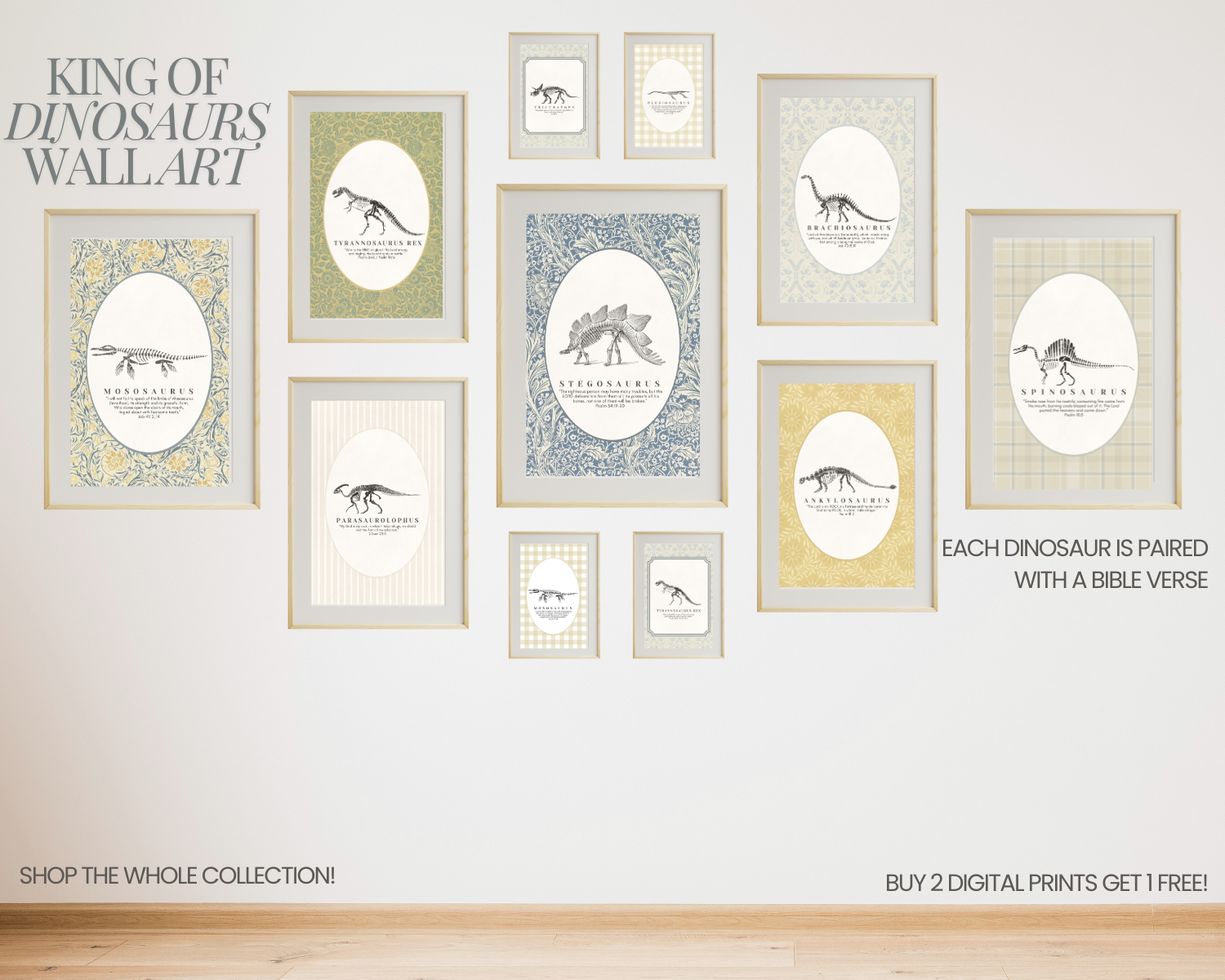 Introduce your little ones to the wonders of dinosaurs and the teachings of Jesus with our King of Dinosaurs digital art download. Perfect for parents who love Jesus with kids who love dinosaurs, this artwork features a beautifully detailed dinosaur fossil in a vintage oval frame. The beige and ivory ticking stripe background adds a neutral touch, making it ideal for any kids’ nursery. Accompanied by a coordinating Bible verse to go with each dinosaur, this piece is a perfect blend of education and faith, helping you teach your kids about Jesus in a fun and engaging way.