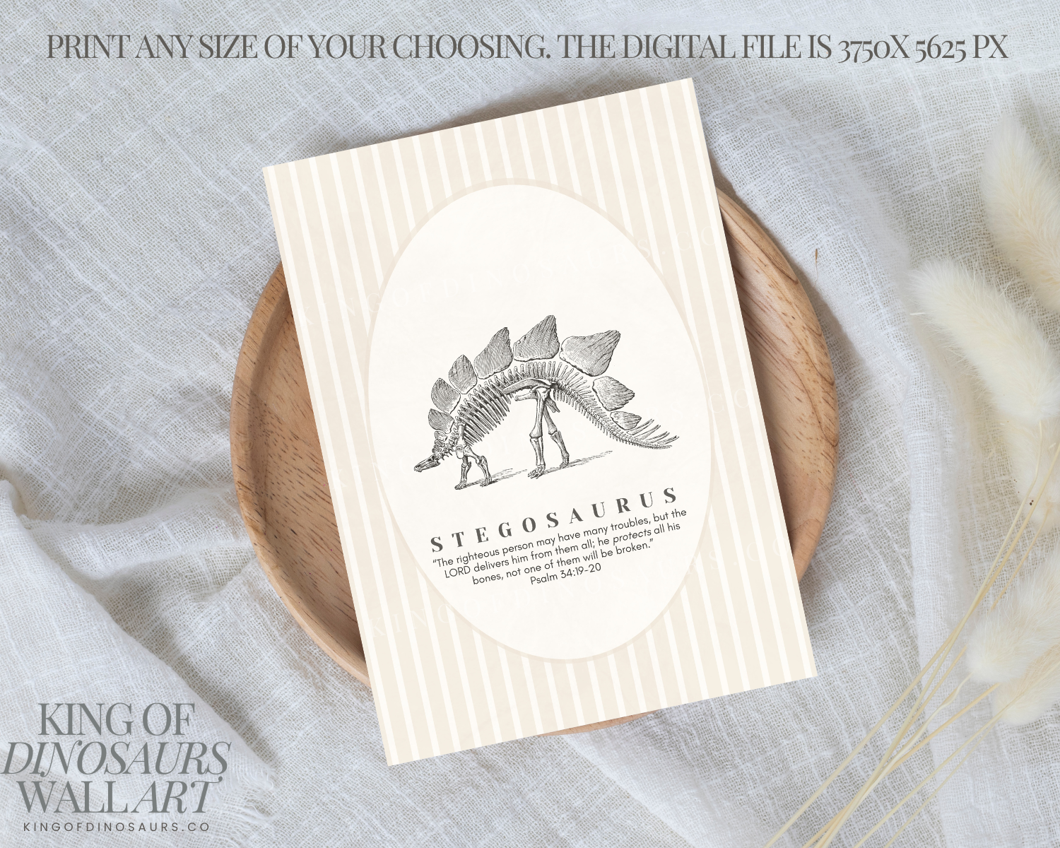 Introduce your little ones to the wonders of dinosaurs and the teachings of Jesus with our King of Dinosaurs digital art download. Perfect for parents who love Jesus and have kids who love dinosaurs, this artwork features a beautifully detailed dinosaur fossil in a vintage oval frame. The beige and ivory ticking stripe background adds a neutral touch, making it ideal for any kids’ nursery. Accompanied by a coordinating Bible verse to go with each dinosaur, this piece is a perfect blend of education and faith, helping you teach your kids about Jesus in a fun and engaging way.