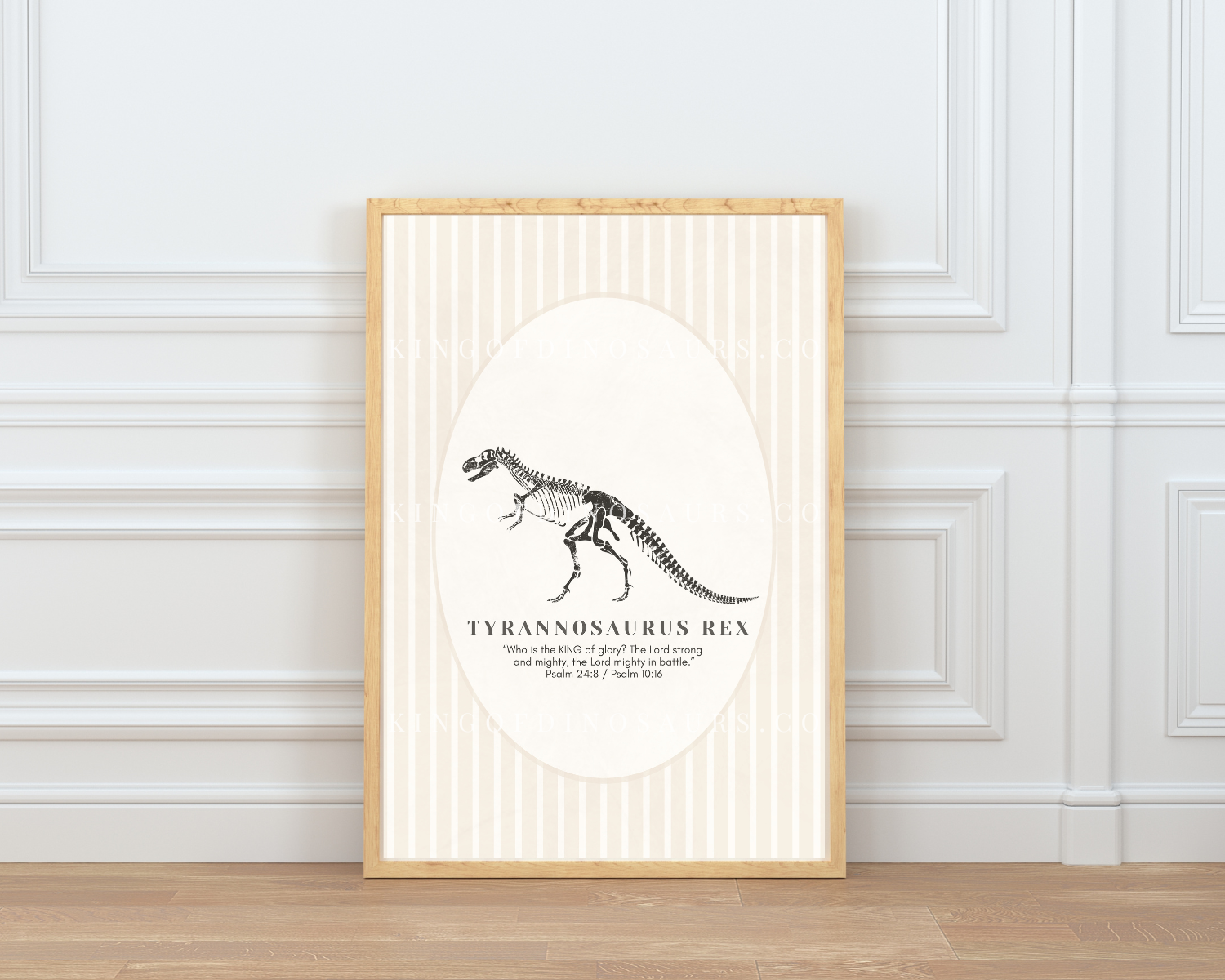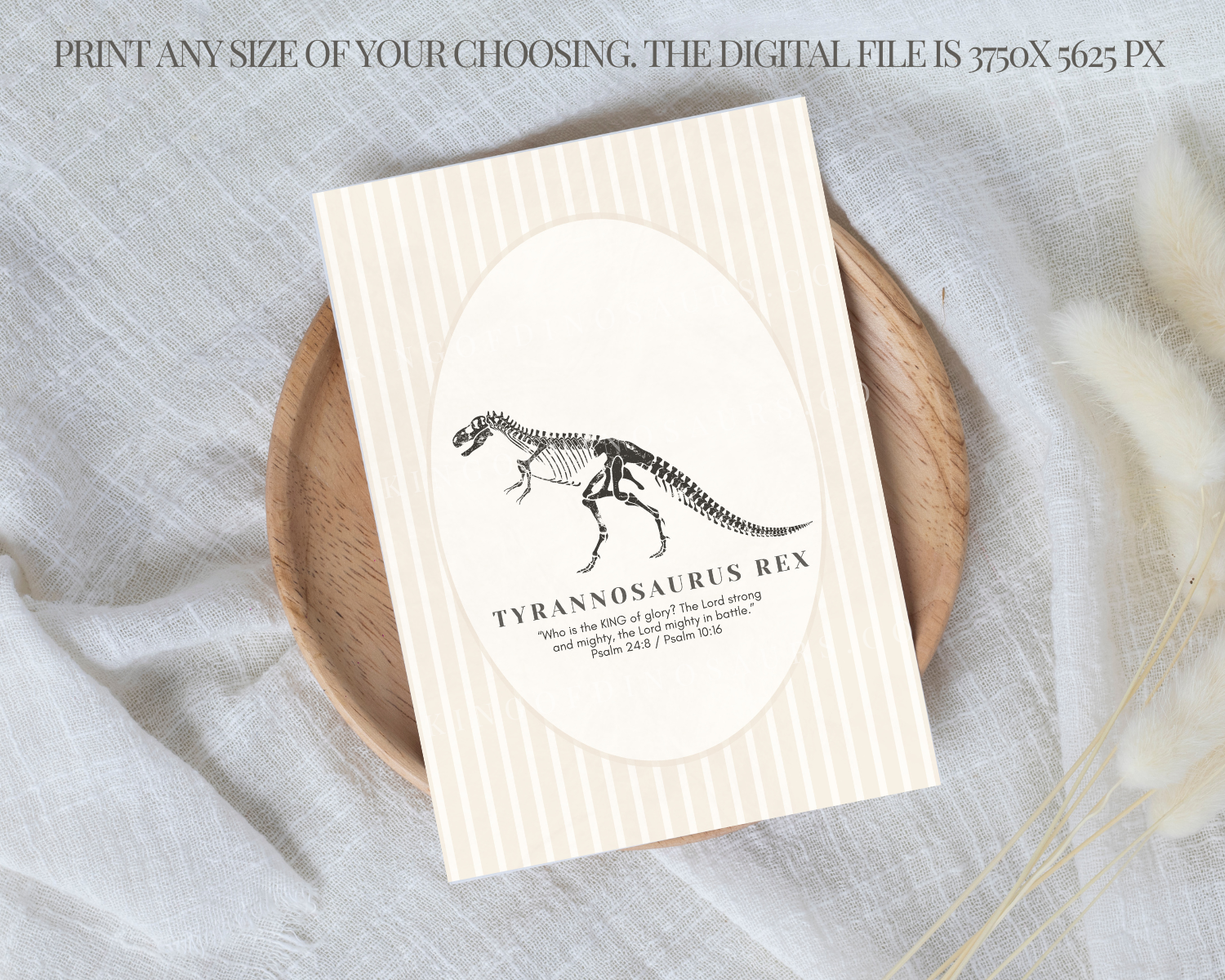 Introduce your little ones to the wonders of dinosaurs and the teachings of Jesus with our King of Dinosaurs digital art download. Perfect for parents who love Jesus and have kids who love dinosaurs, this artwork features a beautifully detailed dinosaur fossil in a vintage oval frame. The beige and ivory ticking stripe background adds a neutral touch, making it ideal for any kids’ nursery. Accompanied by a coordinating Bible verse to go with each dinosaur, this piece is a perfect blend of education and faith, helping you teach your kids about Jesus in a fun and engaging way.