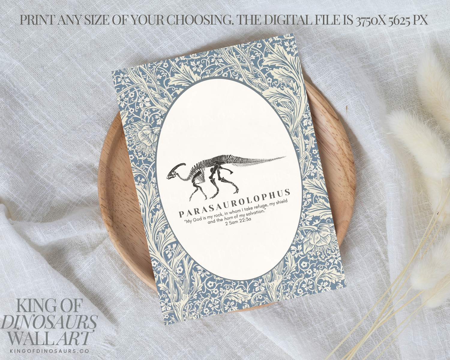 Introduce your little ones to the wonders of dinosaurs and the teachings of Jesus with our King of Dinosaurs digital art download. Perfect for parents who love Jesus and have kids who love dinosaurs, this artwork features a beautifully detailed dinosaur fossil in a vintage oval frame. The beige and ivory ticking stripe background adds a neutral touch, making it ideal for any kids’ nursery. Accompanied by a coordinating Bible verse to go with each dinosaur, this piece is a perfect blend of education and faith, helping you teach your kids about Jesus in a fun and engaging way.