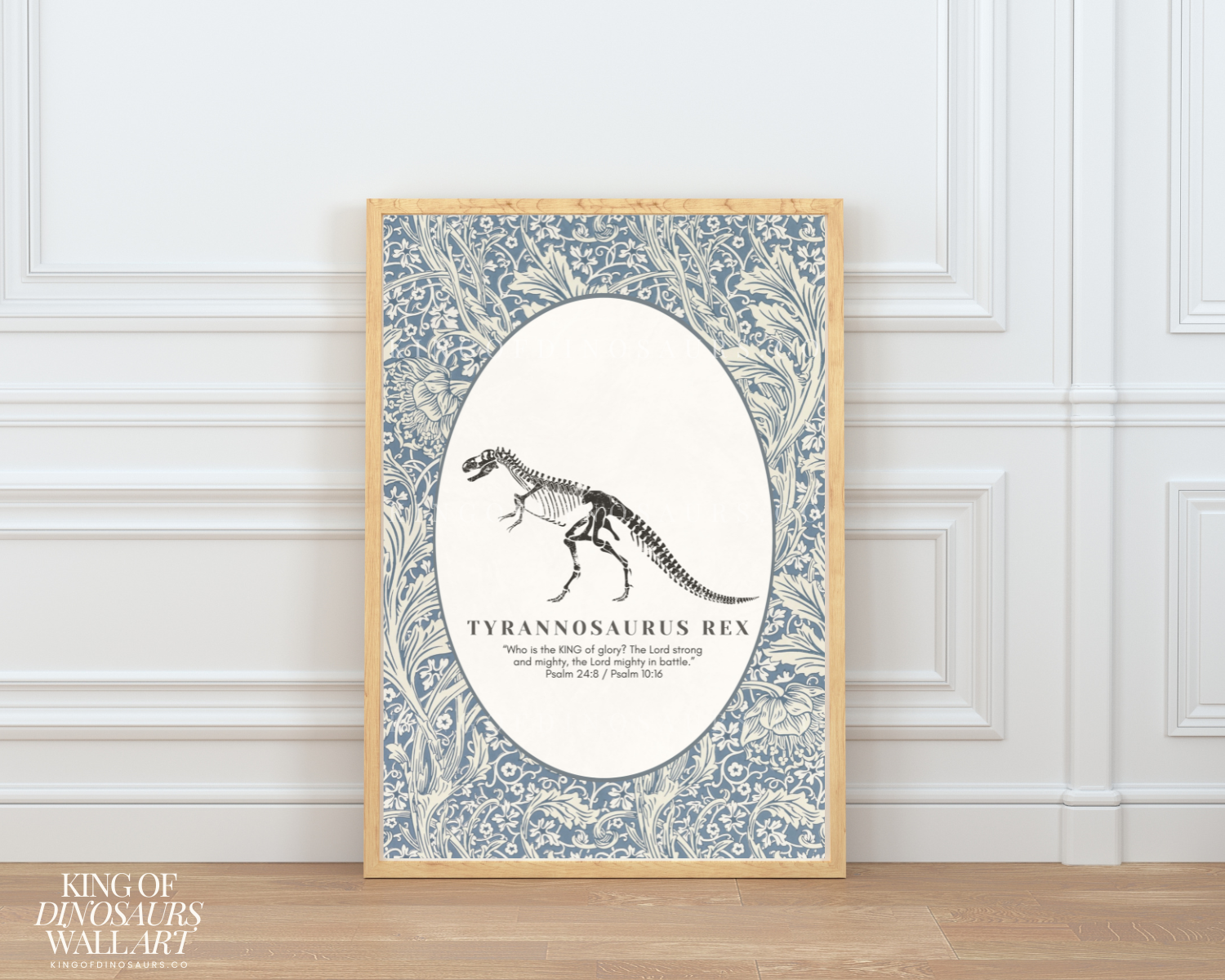 Introduce your little ones to the wonders of dinosaurs and the teachings of Jesus with our King of Dinosaurs digital art download. Perfect for parents who love Jesus and have kids who love dinosaurs, this artwork features a beautifully detailed dinosaur fossil in a vintage oval frame. The beige and ivory ticking stripe background adds a neutral touch, making it ideal for any kids’ nursery. Accompanied by a coordinating Bible verse to go with each dinosaur, this piece is a perfect blend of education and faith, helping you teach your kids about Jesus in a fun and engaging way.