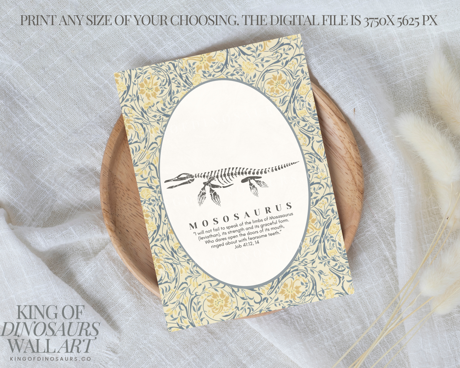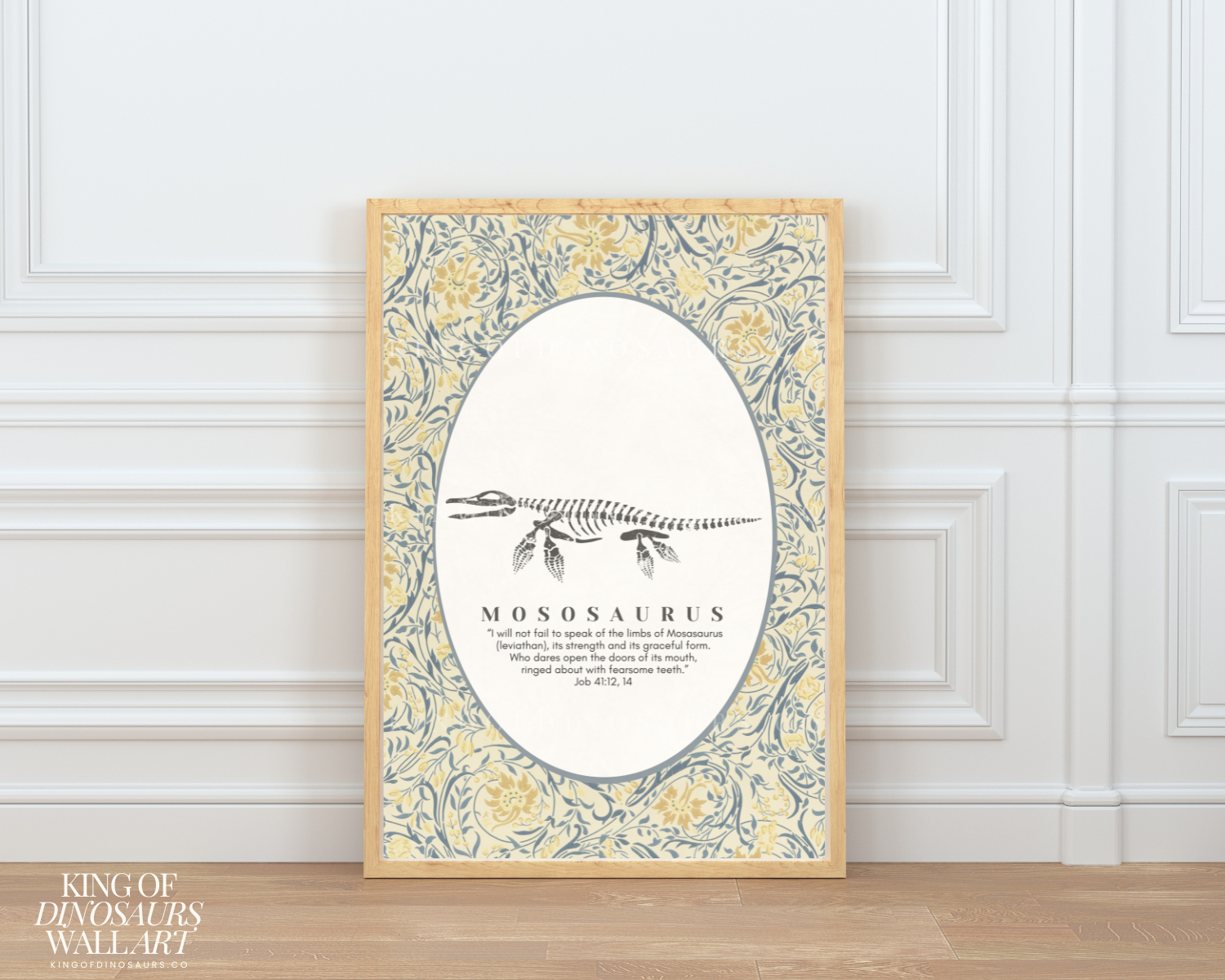 Introduce your little ones to the wonders of dinosaurs and the teachings of Jesus with our King of Dinosaurs digital art download. Perfect for parents who love Jesus and have kids who love dinosaurs, this artwork features a beautifully detailed dinosaur fossil in a vintage oval frame. The beige and ivory ticking stripe background adds a neutral touch, making it ideal for any kids’ nursery. Accompanied by a coordinating Bible verse to go with each dinosaur, this piece is a perfect blend of education and faith, helping you teach your kids about Jesus in a fun and engaging way.