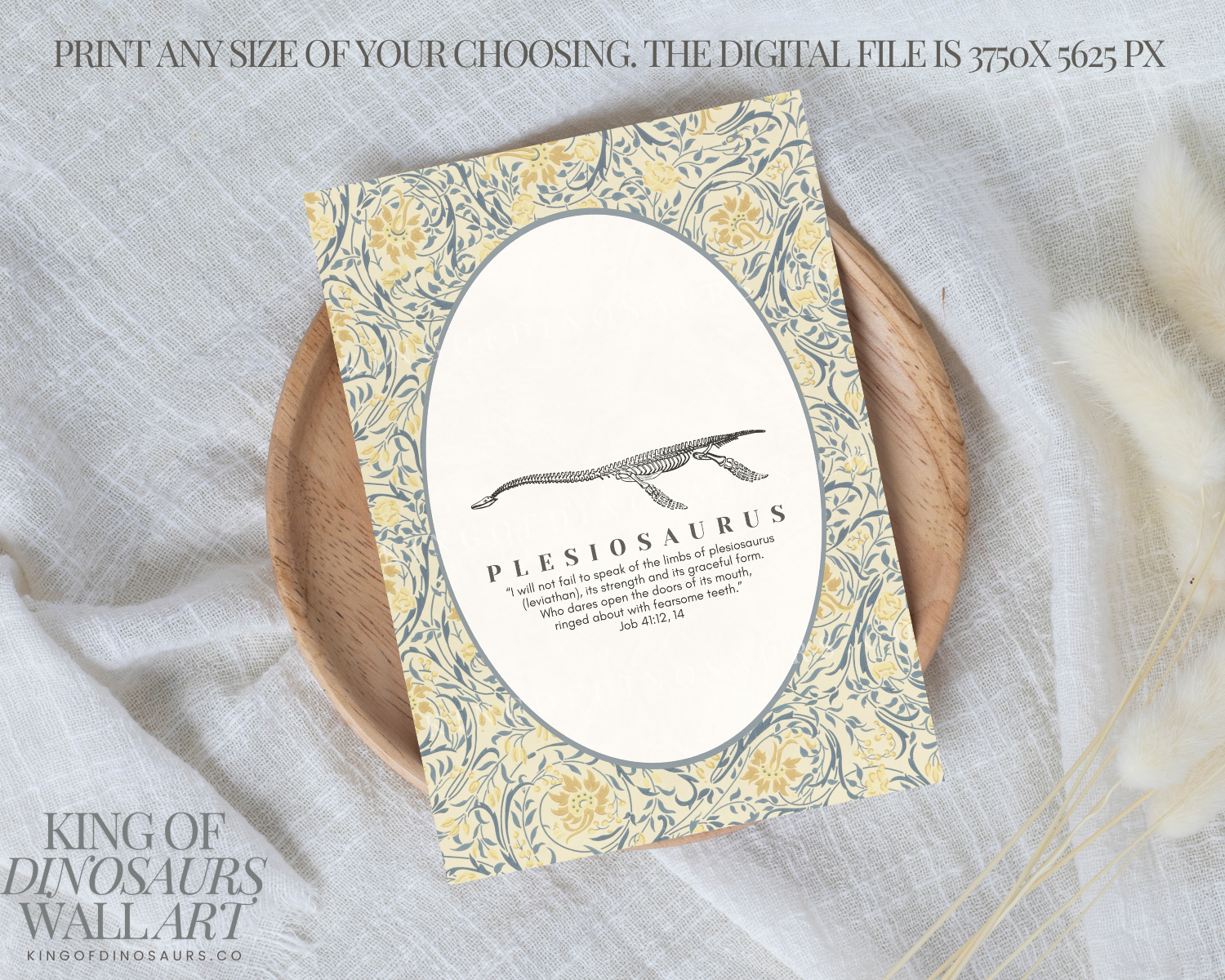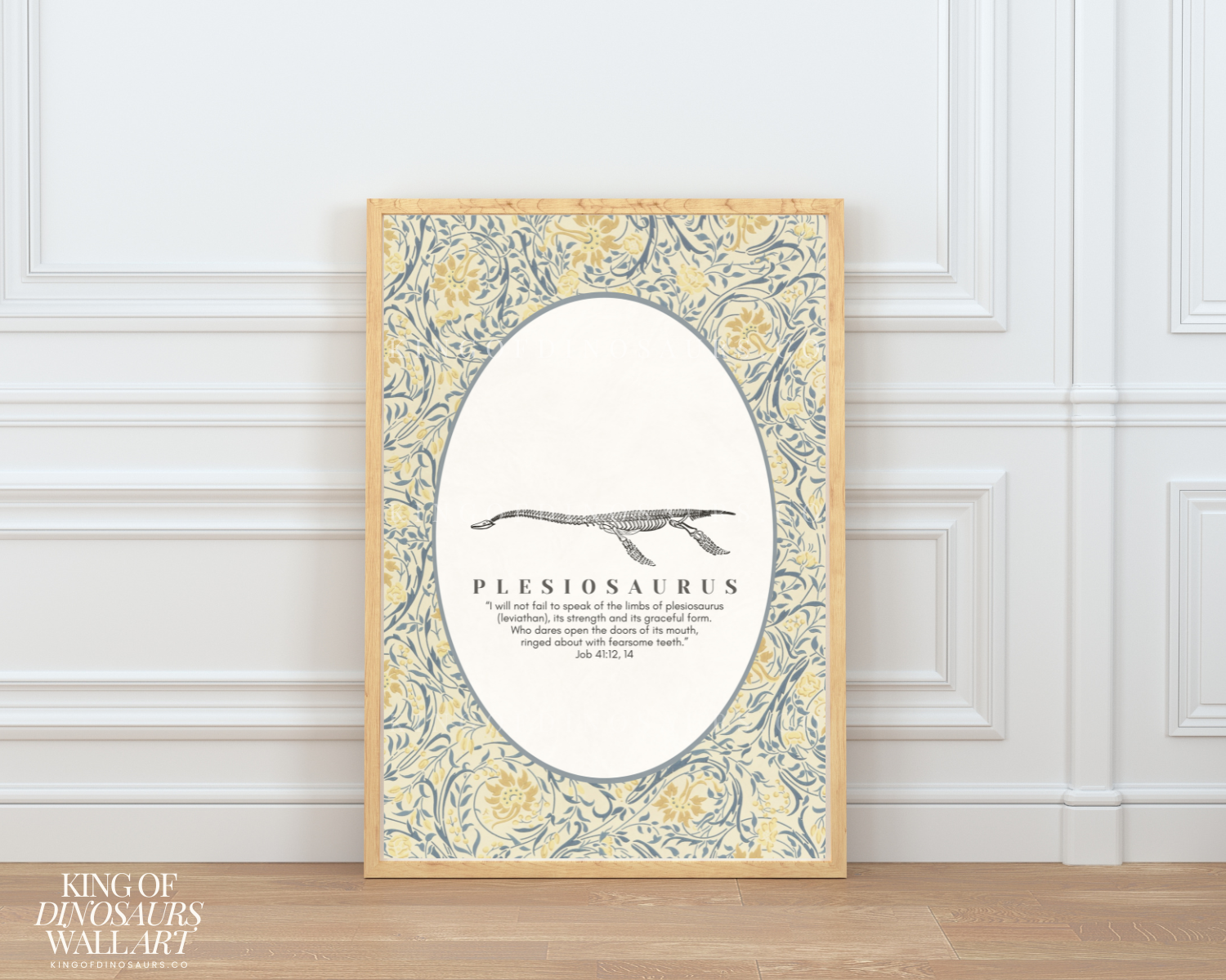 Introduce your little ones to the wonders of dinosaurs and the teachings of Jesus with our King of Dinosaurs digital art download. Perfect for parents who love Jesus and have kids who love dinosaurs, this artwork features a beautifully detailed dinosaur fossil in a vintage oval frame. The beige and ivory ticking stripe background adds a neutral touch, making it ideal for any kids’ nursery. Accompanied by a coordinating Bible verse to go with each dinosaur, this piece is a perfect blend of education and faith, helping you teach your kids about Jesus in a fun and engaging way.