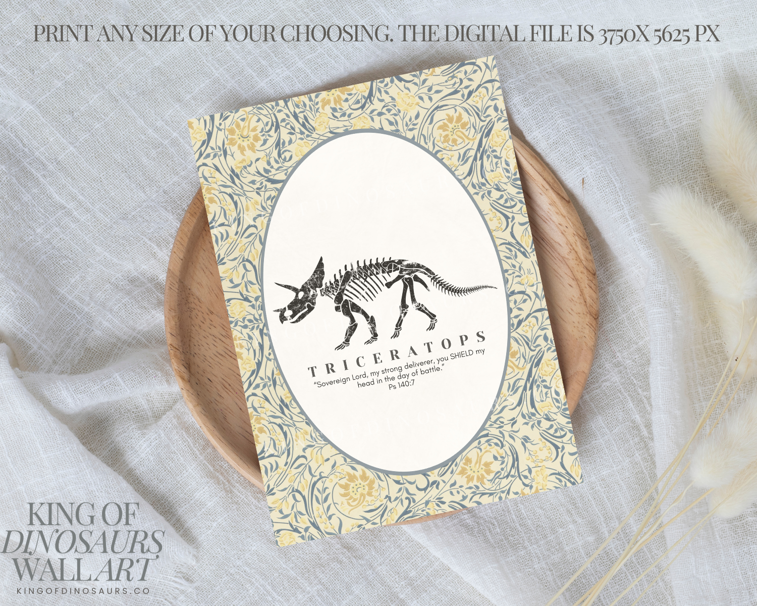 Introduce your little ones to the wonders of dinosaurs and the teachings of Jesus with our King of Dinosaurs digital art download. Perfect for parents who love Jesus and have kids who love dinosaurs, this artwork features a beautifully detailed dinosaur fossil in a vintage oval frame. The beige and ivory ticking stripe background adds a neutral touch, making it ideal for any kids’ nursery. Accompanied by a coordinating Bible verse to go with each dinosaur, this piece is a perfect blend of education and faith, helping you teach your kids about Jesus in a fun and engaging way.