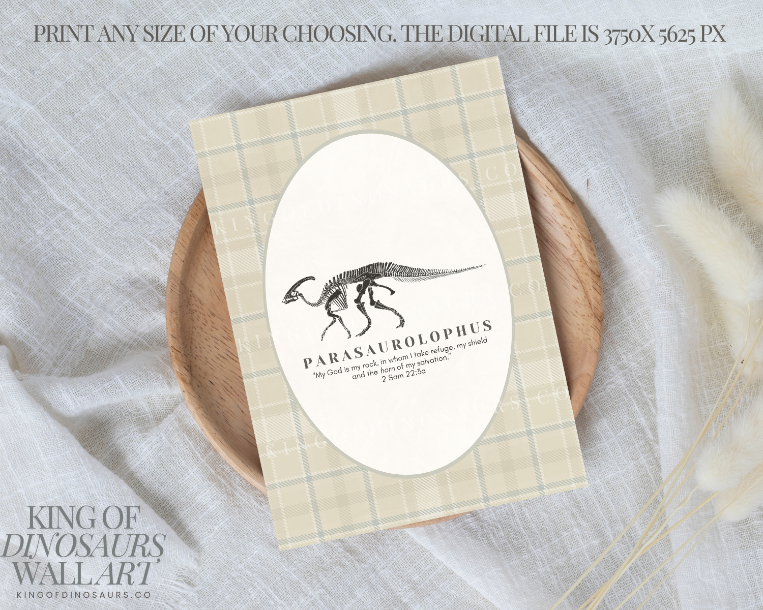 Introduce your little ones to the wonders of dinosaurs and the teachings of Jesus with our King of Dinosaurs digital art download. Perfect for parents who love Jesus and have kids who love dinosaurs, this artwork features a beautifully detailed dinosaur fossil in a vintage oval frame. The beige and ivory ticking stripe background adds a neutral touch, making it ideal for any kids’ nursery. Accompanied by a coordinating Bible verse to go with each dinosaur, this piece is a perfect blend of education and faith, helping you teach your kids about Jesus in a fun and engaging way.