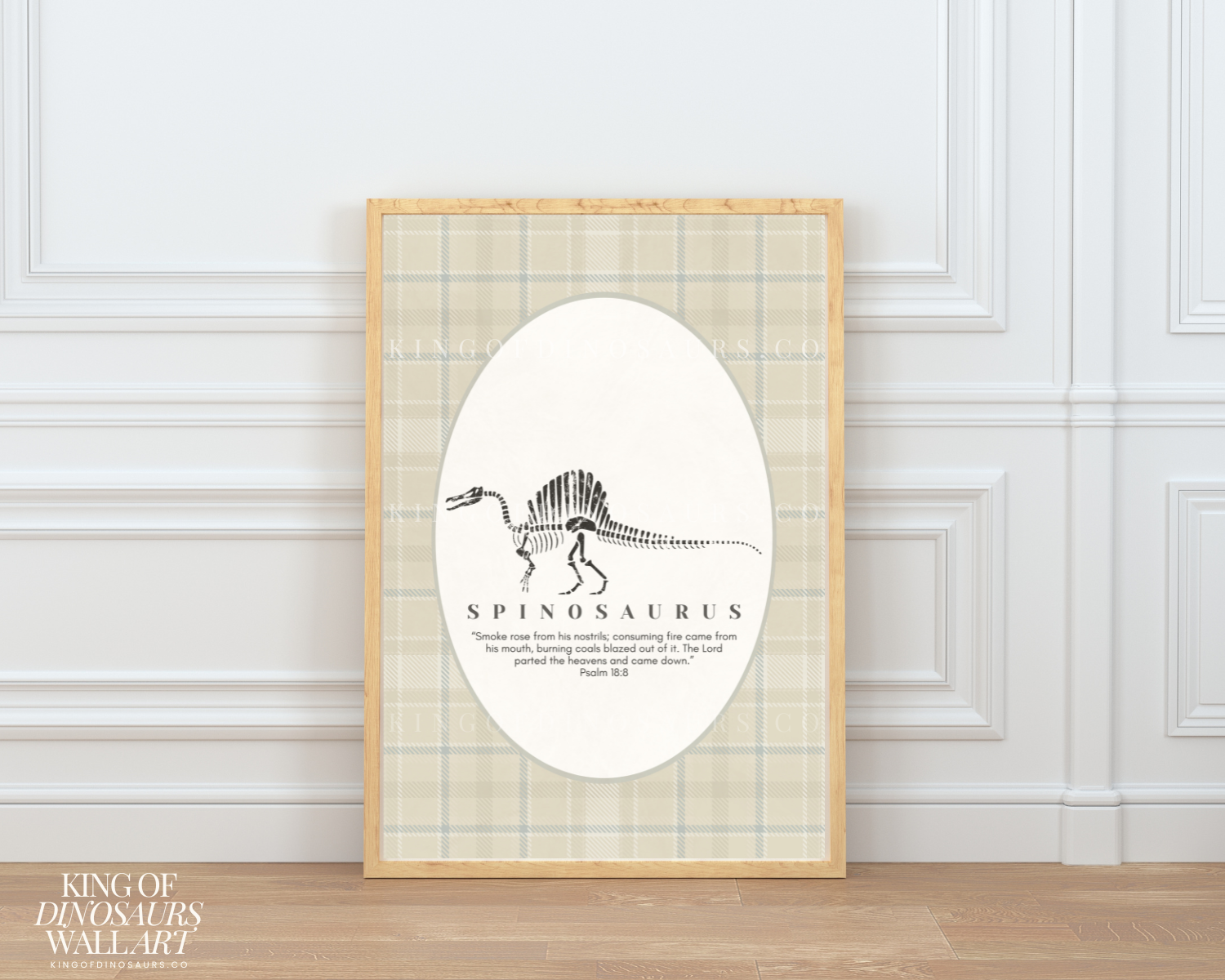 Introduce your little ones to the wonders of dinosaurs and the teachings of Jesus with our King of Dinosaurs digital art download. Perfect for parents who love Jesus and have kids who love dinosaurs, this artwork features a beautifully detailed dinosaur fossil in a vintage oval frame. The beige and ivory ticking stripe background adds a neutral touch, making it ideal for any kids’ nursery. Accompanied by a coordinating Bible verse to go with each dinosaur, this piece is a perfect blend of education and faith, helping you teach your kids about Jesus in a fun and engaging way.