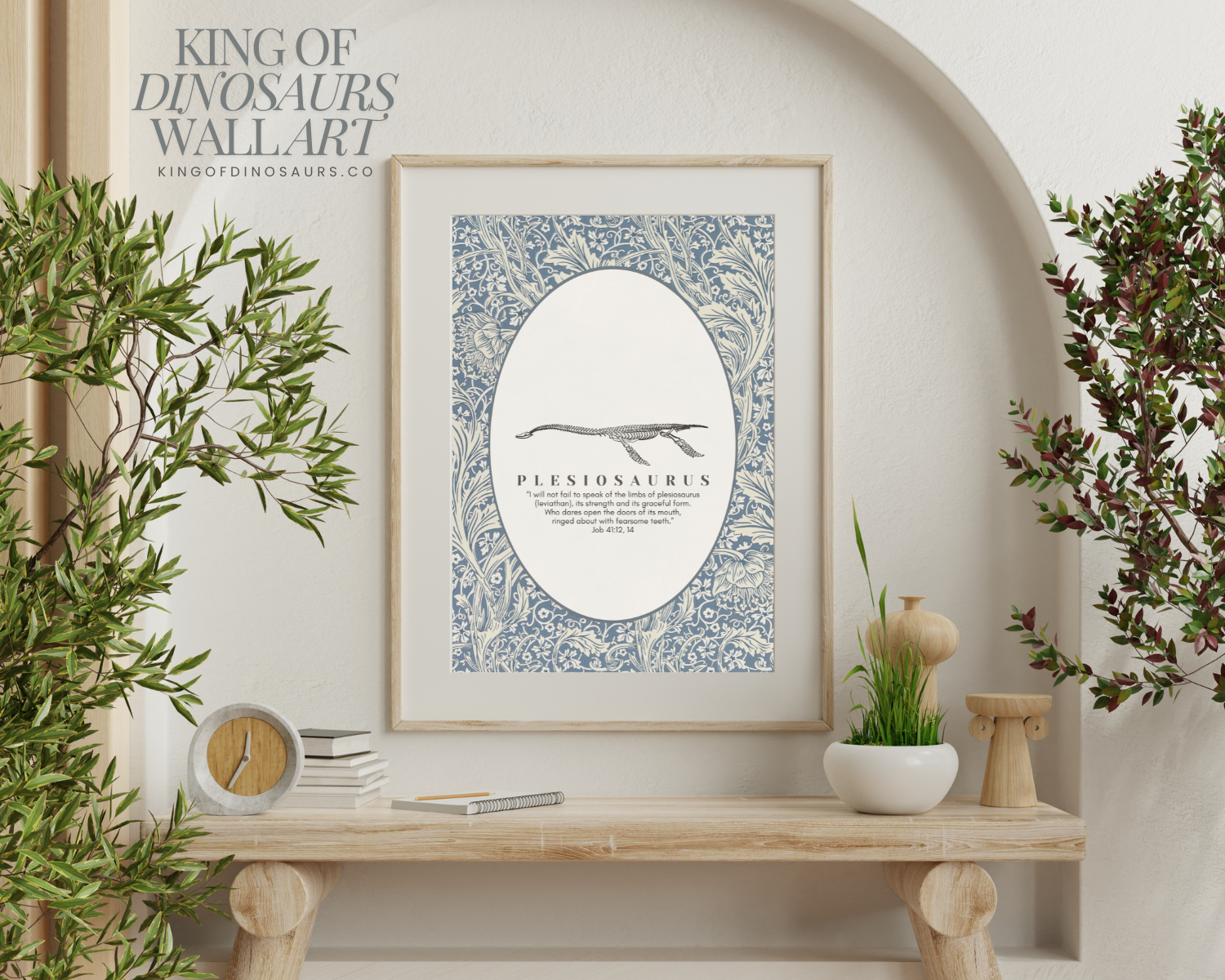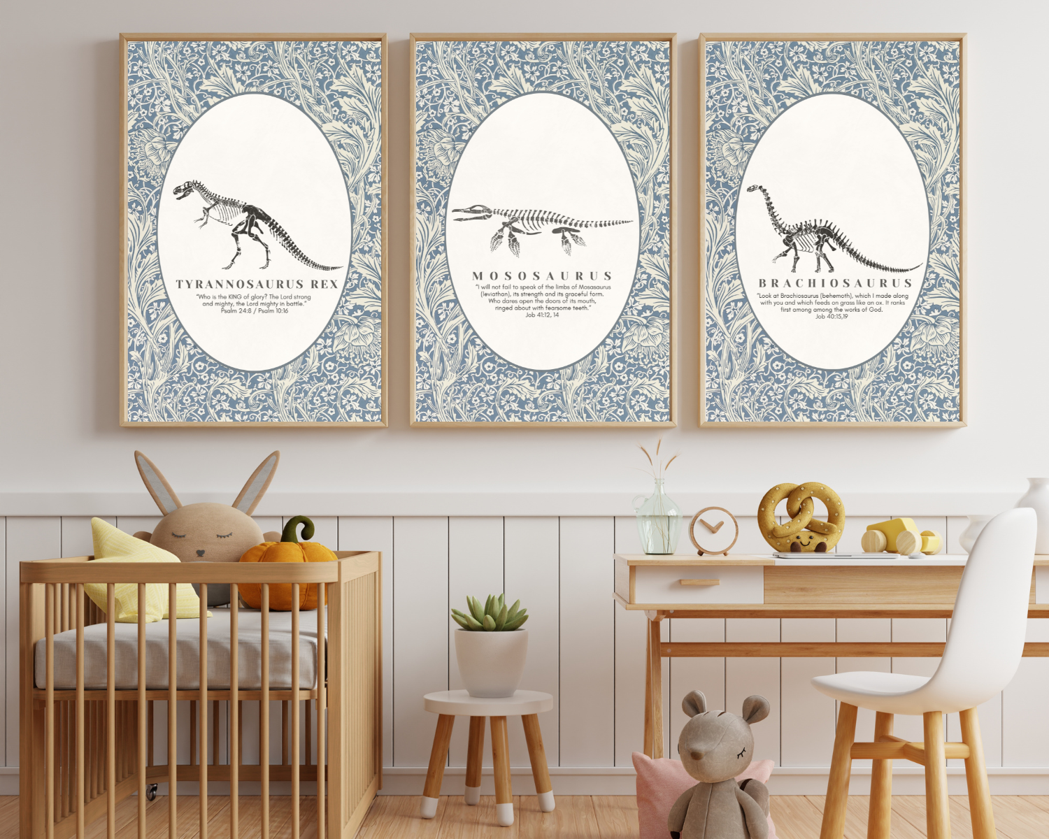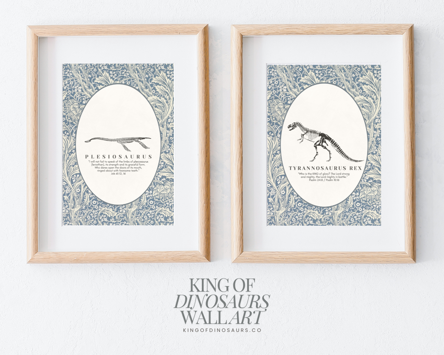 Introduce your little ones to the wonders of dinosaurs and the teachings of Jesus with our King of Dinosaurs digital art download. Perfect for parents who love Jesus and have kids who love dinosaurs, this artwork features a beautifully detailed dinosaur fossil in a vintage oval frame. The beige and ivory ticking stripe background adds a neutral touch, making it ideal for any kids’ nursery. Accompanied by a coordinating Bible verse to go with each dinosaur, this piece is a perfect blend of education and faith, helping you teach your kids about Jesus in a fun and engaging way.