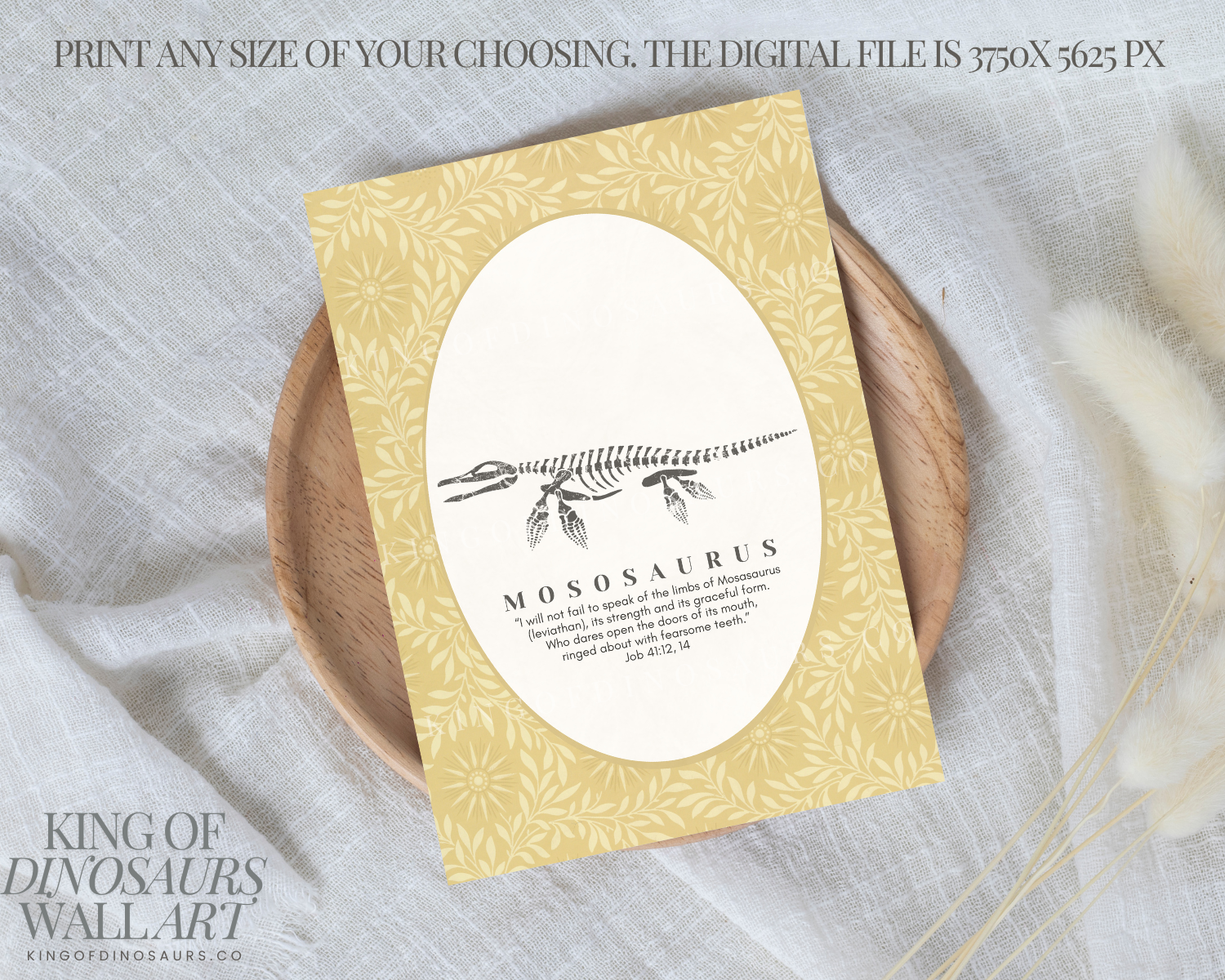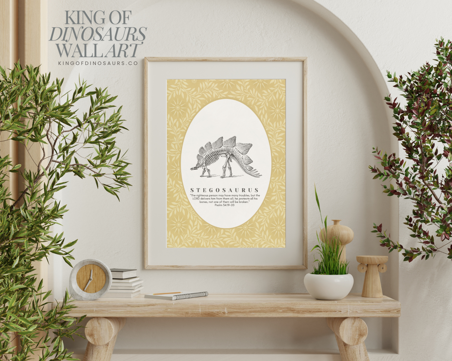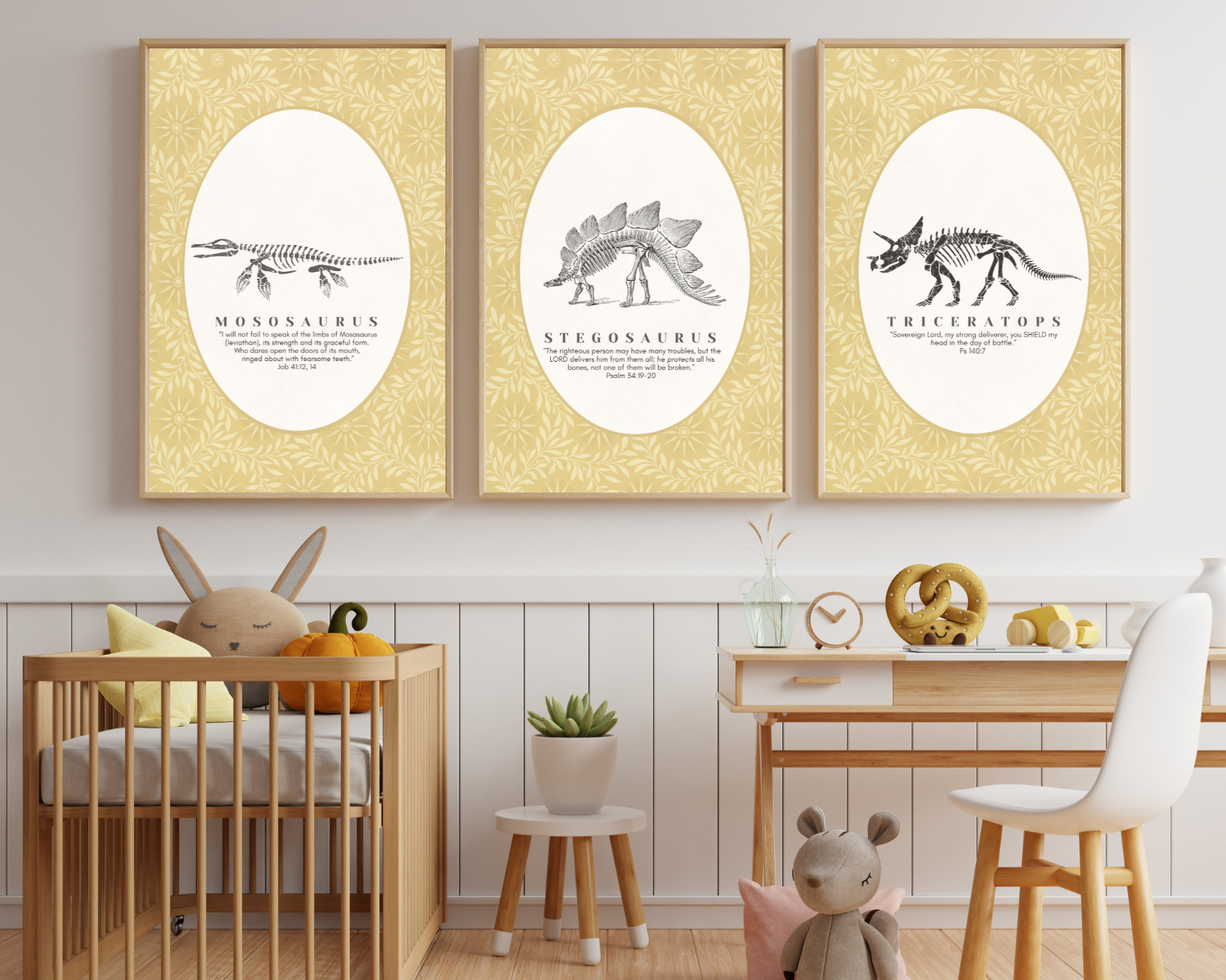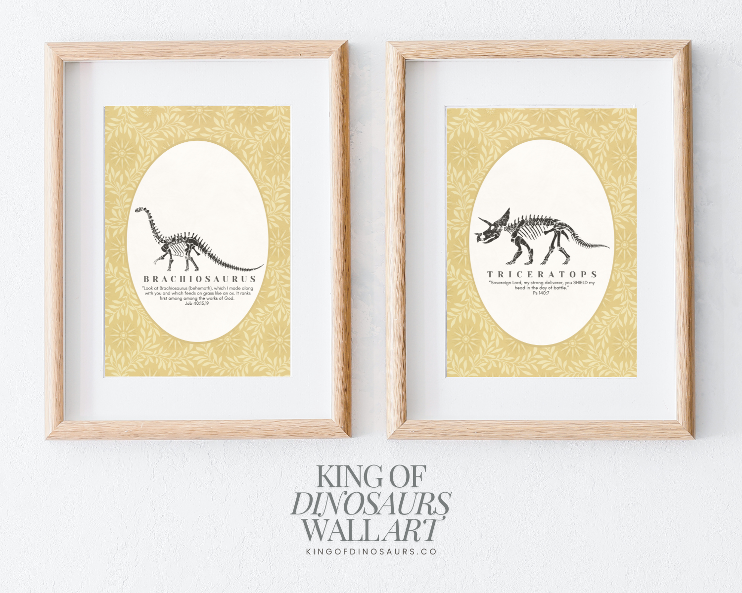 Introduce your little ones to the wonders of dinosaurs and the teachings of Jesus with our King of Dinosaurs digital art download. Perfect for parents who love Jesus and have kids who love dinosaurs, this artwork features a beautifully detailed dinosaur fossil in a vintage oval frame. The beige and ivory ticking stripe background adds a neutral touch, making it ideal for any kids’ nursery. Accompanied by a coordinating Bible verse to go with each dinosaur, this piece is a perfect blend of education and faith, helping you teach your kids about Jesus in a fun and engaging way.