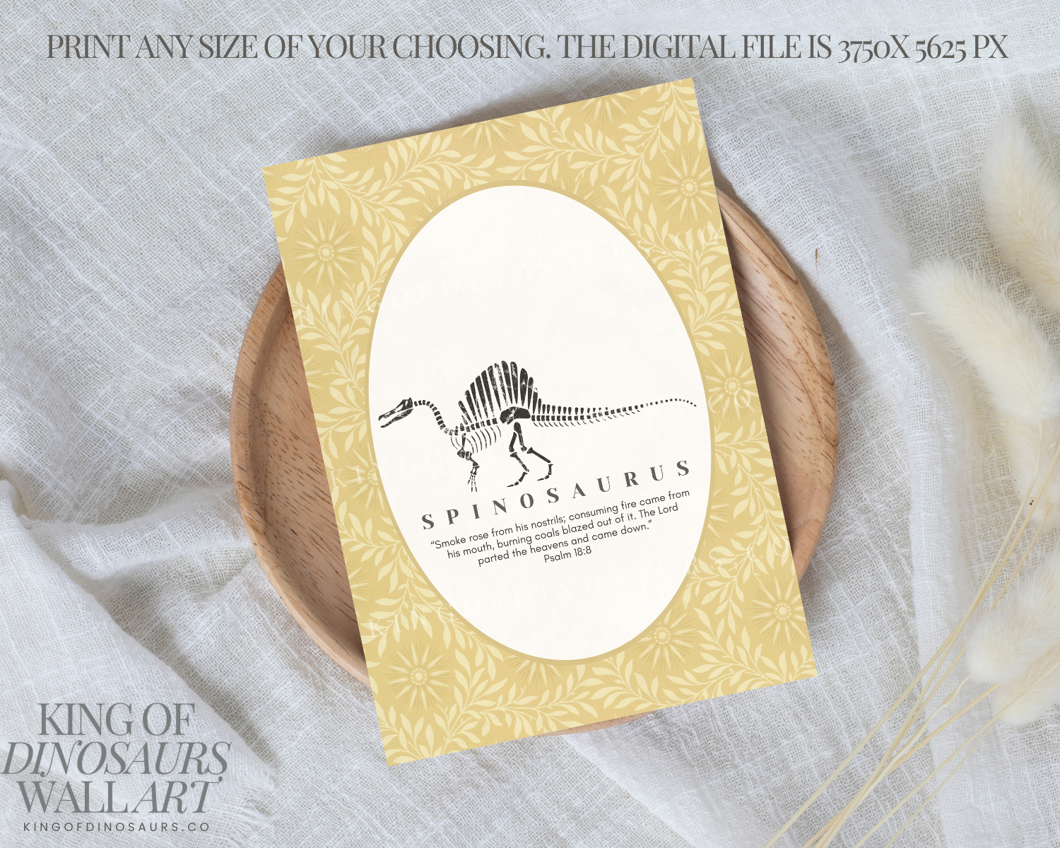 Introduce your little ones to the wonders of dinosaurs and the teachings of Jesus with our King of Dinosaurs digital art download. Perfect for parents who love Jesus and have kids who love dinosaurs, this artwork features a beautifully detailed dinosaur fossil in a vintage oval frame. The beige and ivory ticking stripe background adds a neutral touch, making it ideal for any kids’ nursery. Accompanied by a coordinating Bible verse to go with each dinosaur, this piece is a perfect blend of education and faith, helping you teach your kids about Jesus in a fun and engaging way.