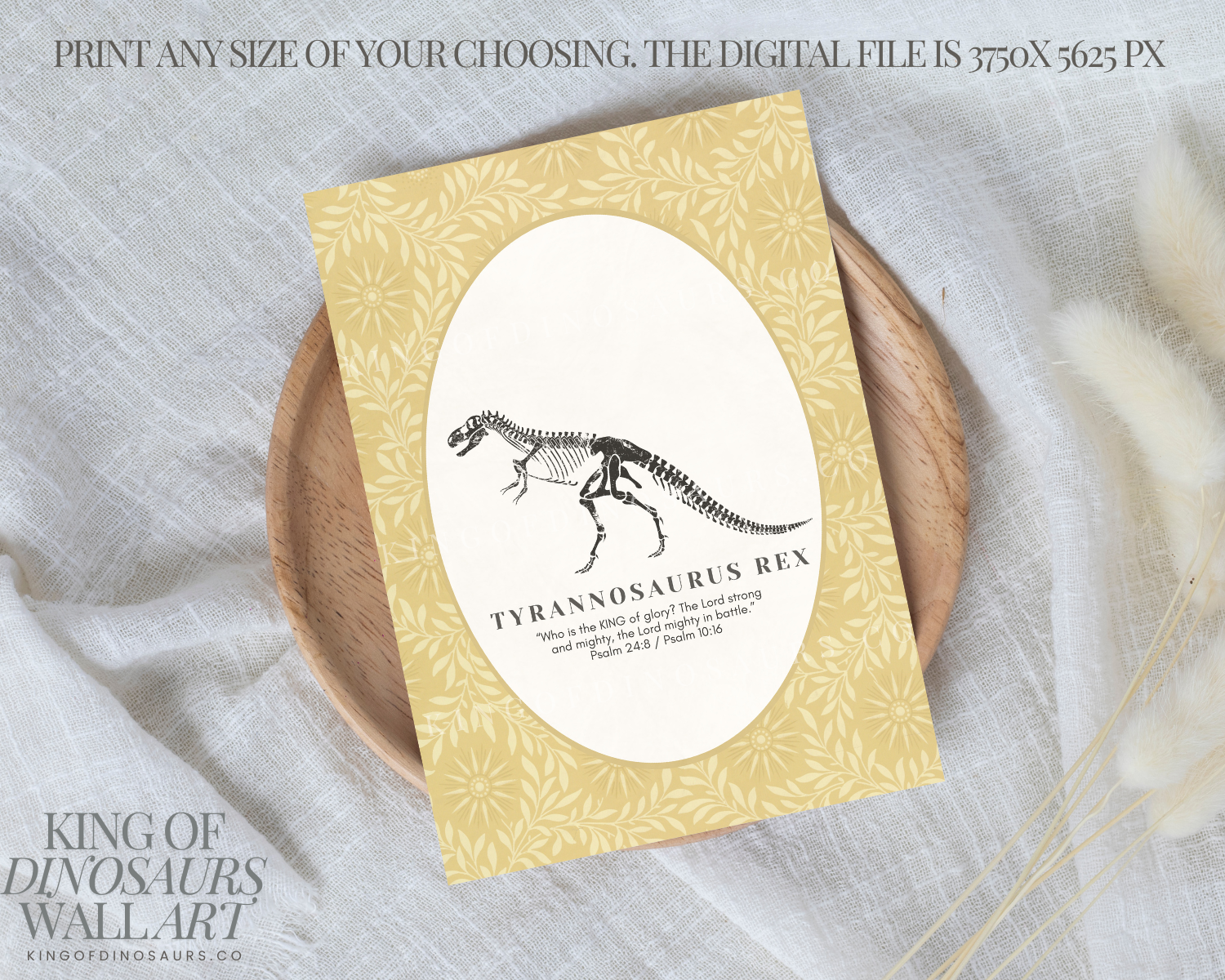 Introduce your little ones to the wonders of dinosaurs and the teachings of Jesus with our King of Dinosaurs digital art download. Perfect for parents who love Jesus and have kids who love dinosaurs, this artwork features a beautifully detailed dinosaur fossil in a vintage oval frame. The beige and ivory ticking stripe background adds a neutral touch, making it ideal for any kids’ nursery. Accompanied by a coordinating Bible verse to go with each dinosaur, this piece is a perfect blend of education and faith, helping you teach your kids about Jesus in a fun and engaging way.