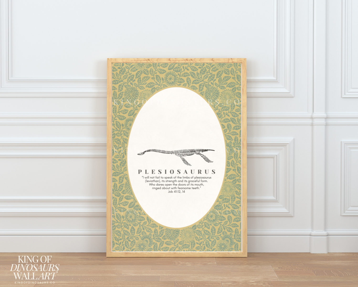 Introduce your little ones to the wonders of dinosaurs and the teachings of Jesus with our King of Dinosaurs digital art download. Perfect for parents who love Jesus and have kids who love dinosaurs, this artwork features a beautifully detailed dinosaur fossil in a vintage oval frame. The beige and ivory ticking stripe background adds a neutral touch, making it ideal for any kids’ nursery. Accompanied by a coordinating Bible verse to go with each dinosaur, this piece is a perfect blend of education and faith, helping you teach your kids about Jesus in a fun and engaging way.