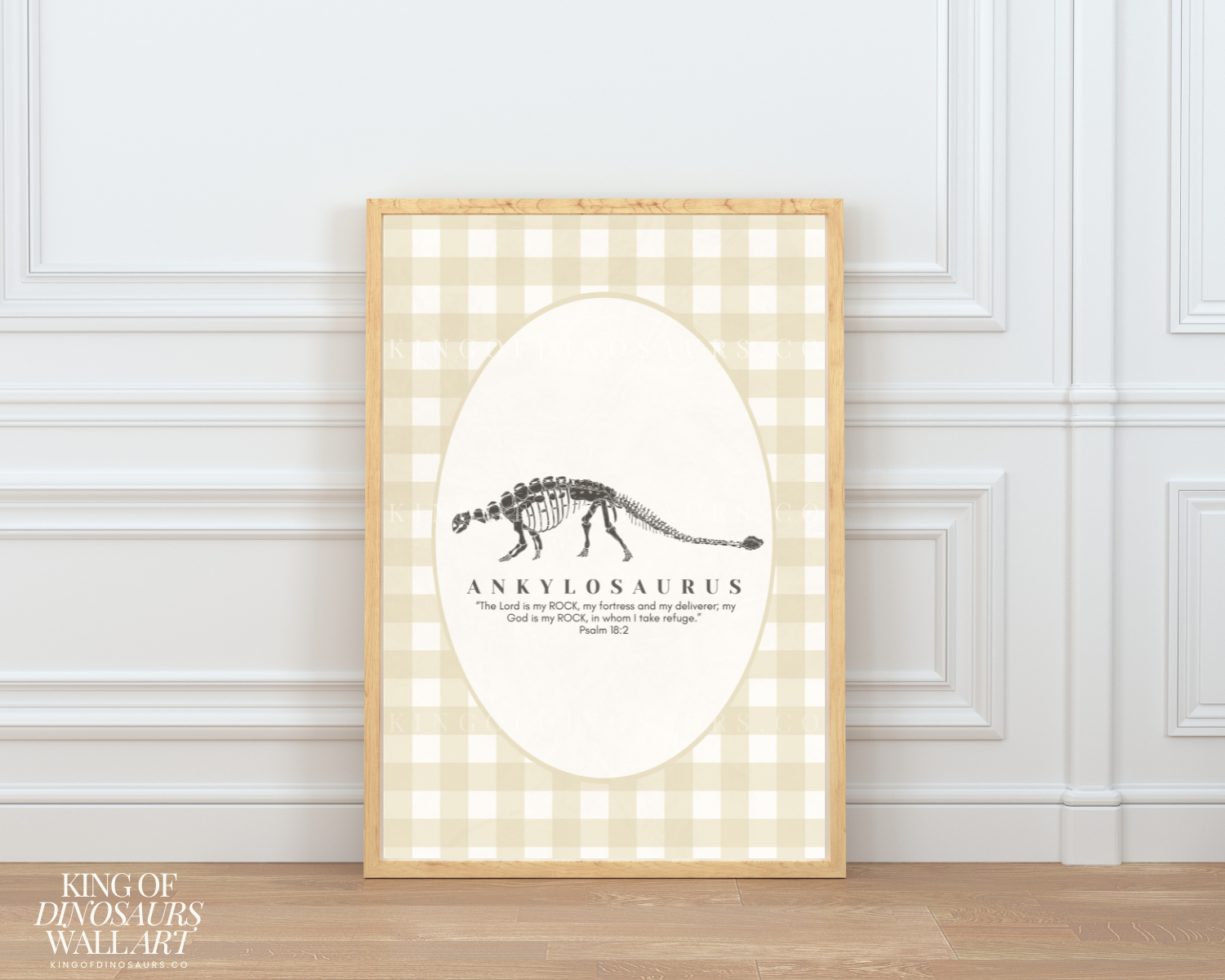 Introduce your little ones to the wonders of dinosaurs and the teachings of Jesus with our King of Dinosaurs digital art download. Perfect for parents who love Jesus with kids who love dinosaurs, this artwork features a beautifully detailed dinosaur fossil in a vintage oval frame. The beige and ivory ticking stripe background adds a neutral touch, making it ideal for any kids’ nursery. Accompanied by a coordinating Bible verse to go with each dinosaur, this piece is a perfect blend of education and faith, helping you teach your kids about Jesus in a fun and engaging way.