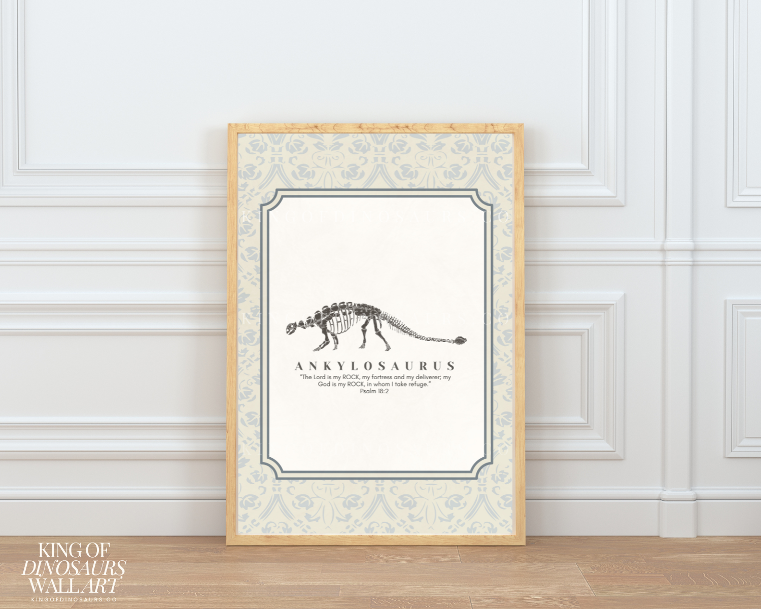 Introduce your little ones to the wonders of dinosaurs and the teachings of Jesus with our King of Dinosaurs digital art download. Perfect for parents who love Jesus with kids who love dinosaurs, this artwork features a beautifully detailed dinosaur fossil in a vintage oval frame. The beige and ivory ticking stripe background adds a neutral touch, making it ideal for any kids’ nursery. Accompanied by a coordinating Bible verse to go with each dinosaur, this piece is a perfect blend of education and faith, helping you teach your kids about Jesus in a fun and engaging way.