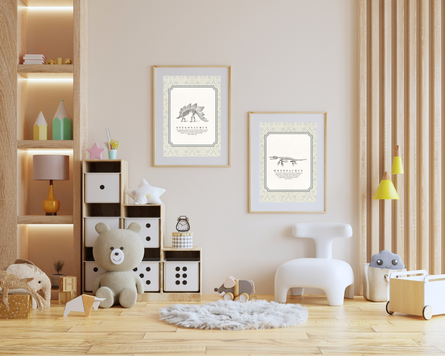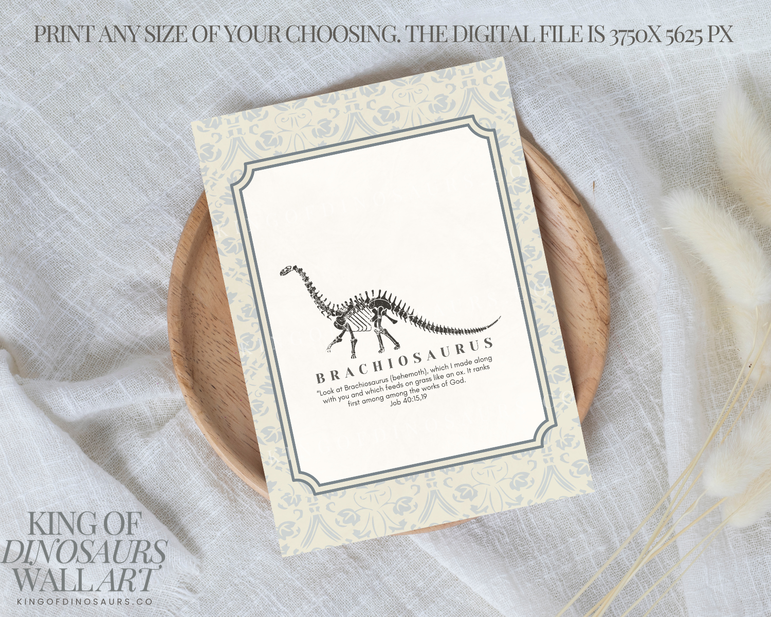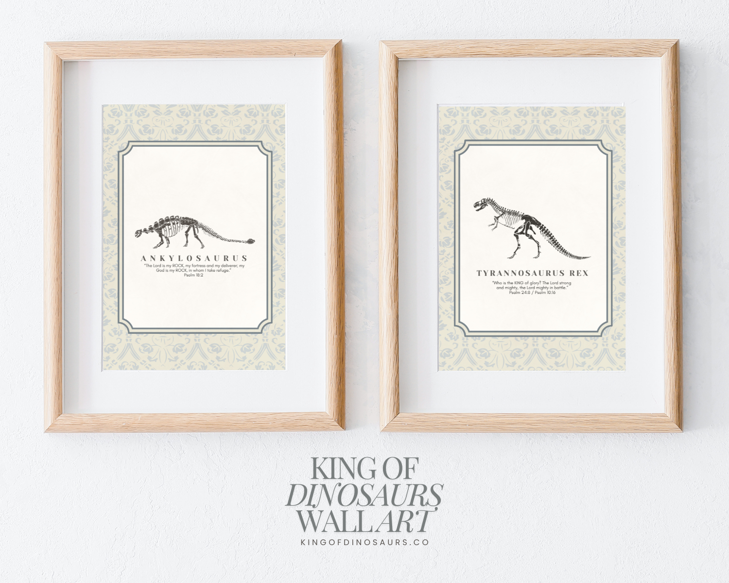 Introduce your little ones to the wonders of dinosaurs and the teachings of Jesus with our King of Dinosaurs digital art download. Perfect for parents who love Jesus and have kids who love dinosaurs, this artwork features a beautifully detailed dinosaur fossil in a vintage oval frame. The beige and ivory ticking stripe background adds a neutral touch, making it ideal for any kids’ nursery. Accompanied by a coordinating Bible verse to go with each dinosaur, this piece is a perfect blend of education and faith, helping you teach your kids about Jesus in a fun and engaging way.