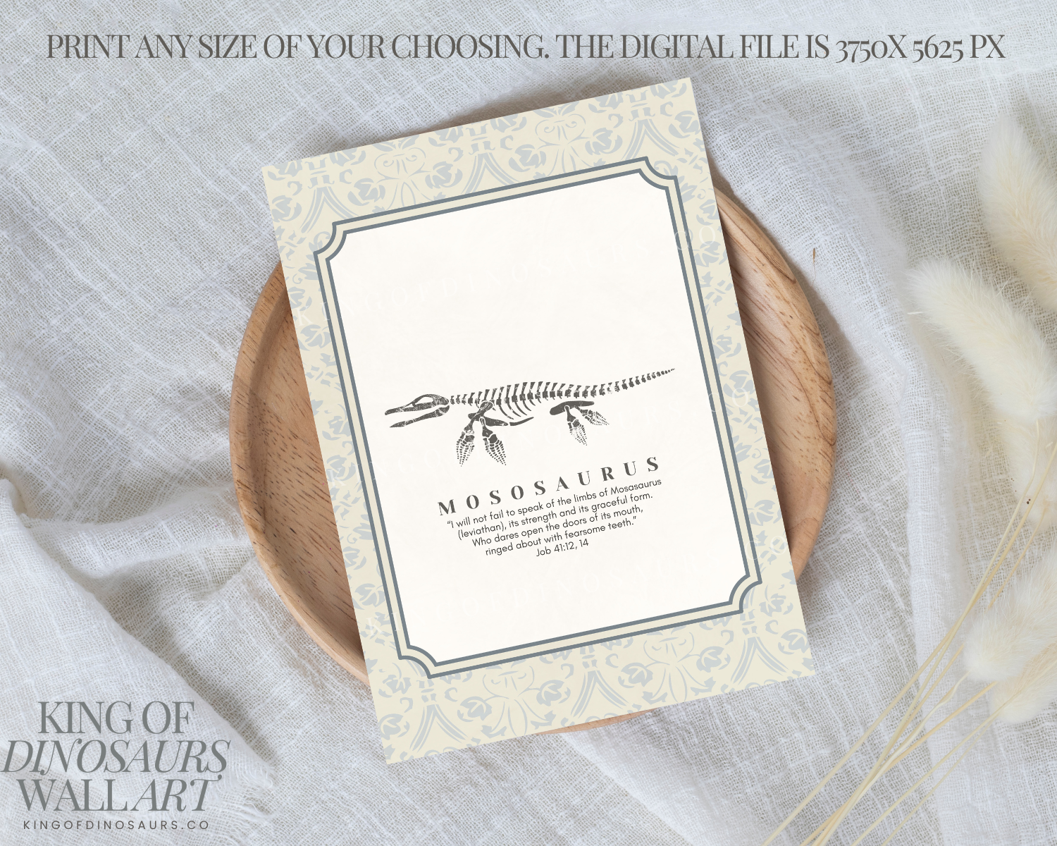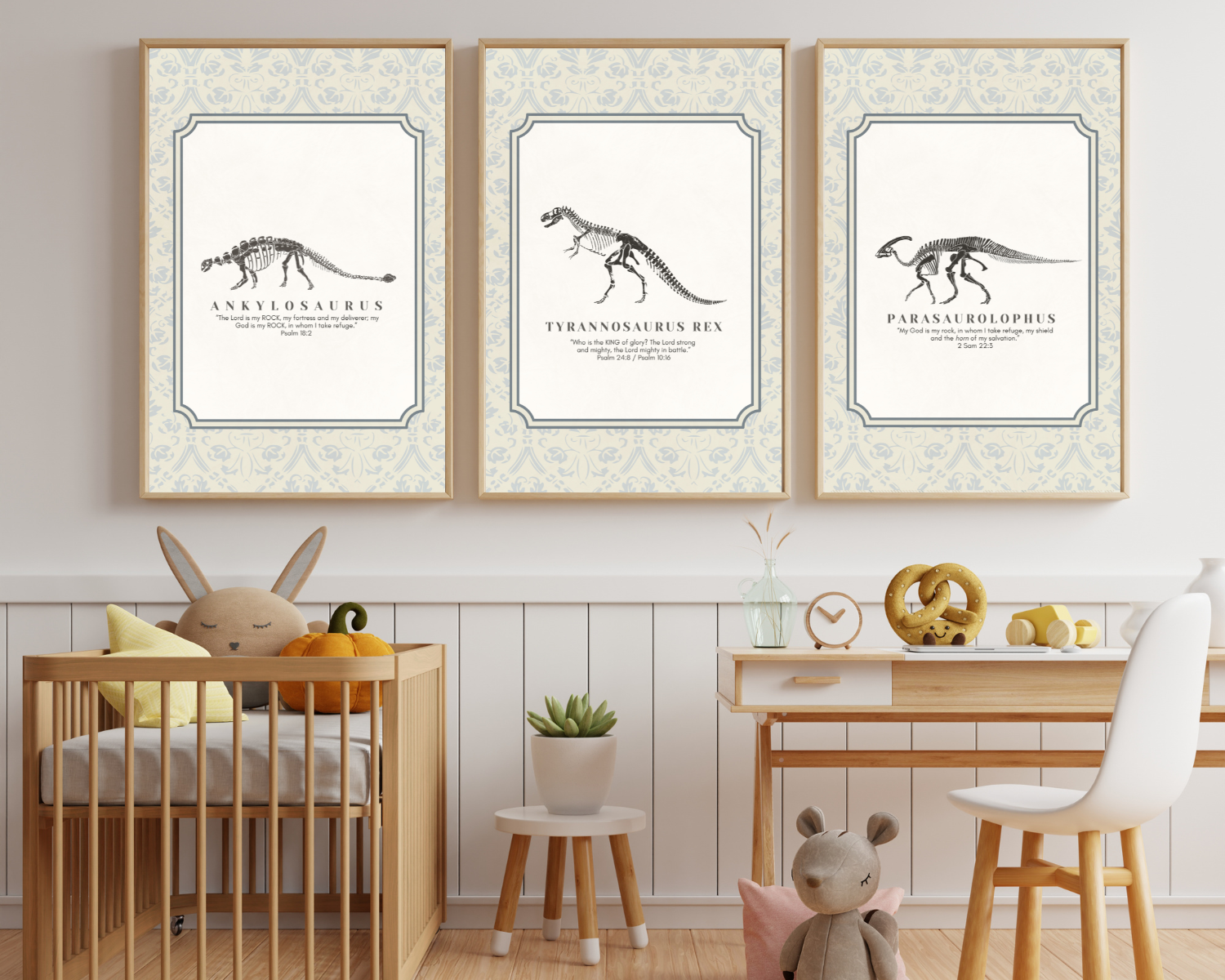 Introduce your little ones to the wonders of dinosaurs and the teachings of Jesus with our King of Dinosaurs digital art download. Perfect for parents who love Jesus and have kids who love dinosaurs, this artwork features a beautifully detailed dinosaur fossil in a vintage oval frame. The beige and ivory ticking stripe background adds a neutral touch, making it ideal for any kids’ nursery. Accompanied by a coordinating Bible verse to go with each dinosaur, this piece is a perfect blend of education and faith, helping you teach your kids about Jesus in a fun and engaging way.