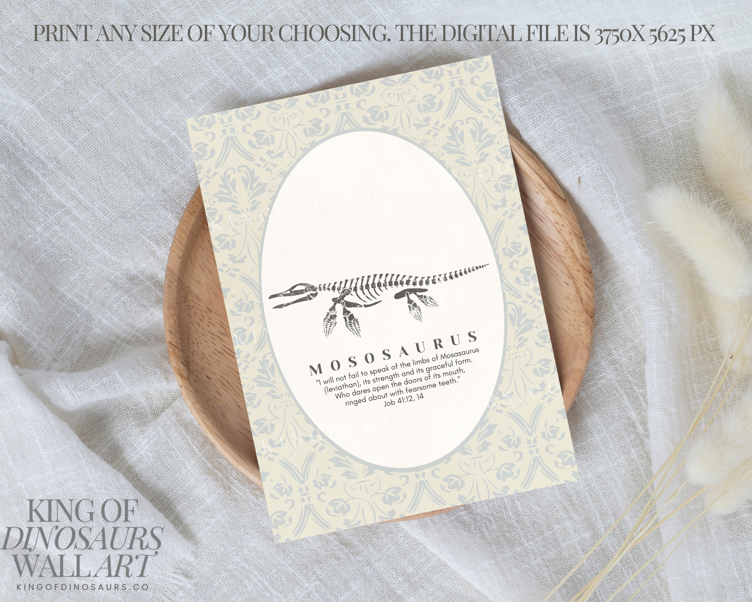 Introduce your little ones to the wonders of dinosaurs and the teachings of Jesus with our King of Dinosaurs digital art download. Perfect for parents who love Jesus and have kids who love dinosaurs, this artwork features a beautifully detailed dinosaur fossil in a vintage oval frame. The beige and ivory ticking stripe background adds a neutral touch, making it ideal for any kids’ nursery. Accompanied by a coordinating Bible verse to go with each dinosaur, this piece is a perfect blend of education and faith, helping you teach your kids about Jesus in a fun and engaging way.