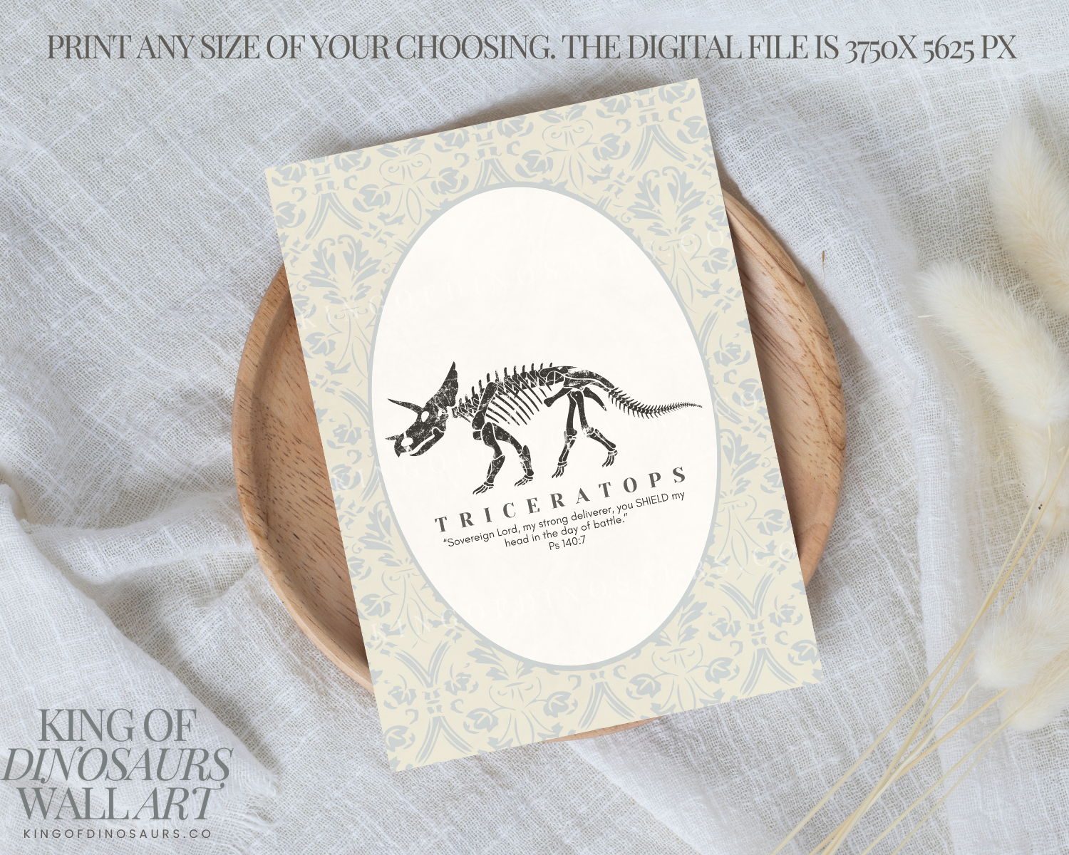 Introduce your little ones to the wonders of dinosaurs and the teachings of Jesus with our King of Dinosaurs digital art download. Perfect for parents who love Jesus and have kids who love dinosaurs, this artwork features a beautifully detailed dinosaur fossil in a vintage oval frame. The beige and ivory ticking stripe background adds a neutral touch, making it ideal for any kids’ nursery. Accompanied by a coordinating Bible verse to go with each dinosaur, this piece is a perfect blend of education and faith, helping you teach your kids about Jesus in a fun and engaging way.