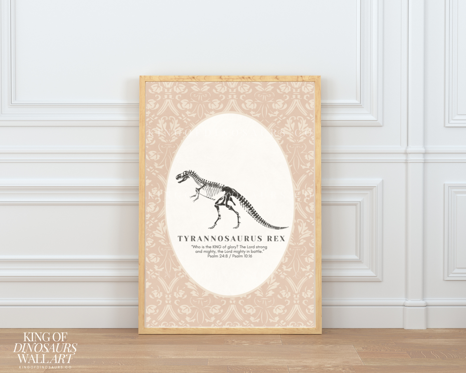 Introduce your little ones to the wonders of dinosaurs and the teachings of Jesus with our King of Dinosaurs digital art download. Perfect for parents who love Jesus and have kids who love dinosaurs, this artwork features a beautifully detailed dinosaur fossil in a vintage oval frame. The beige and ivory ticking stripe background adds a neutral touch, making it ideal for any kids’ nursery. Accompanied by a coordinating Bible verse to go with each dinosaur, this piece is a perfect blend of education and faith, helping you teach your kids about Jesus in a fun and engaging way.
