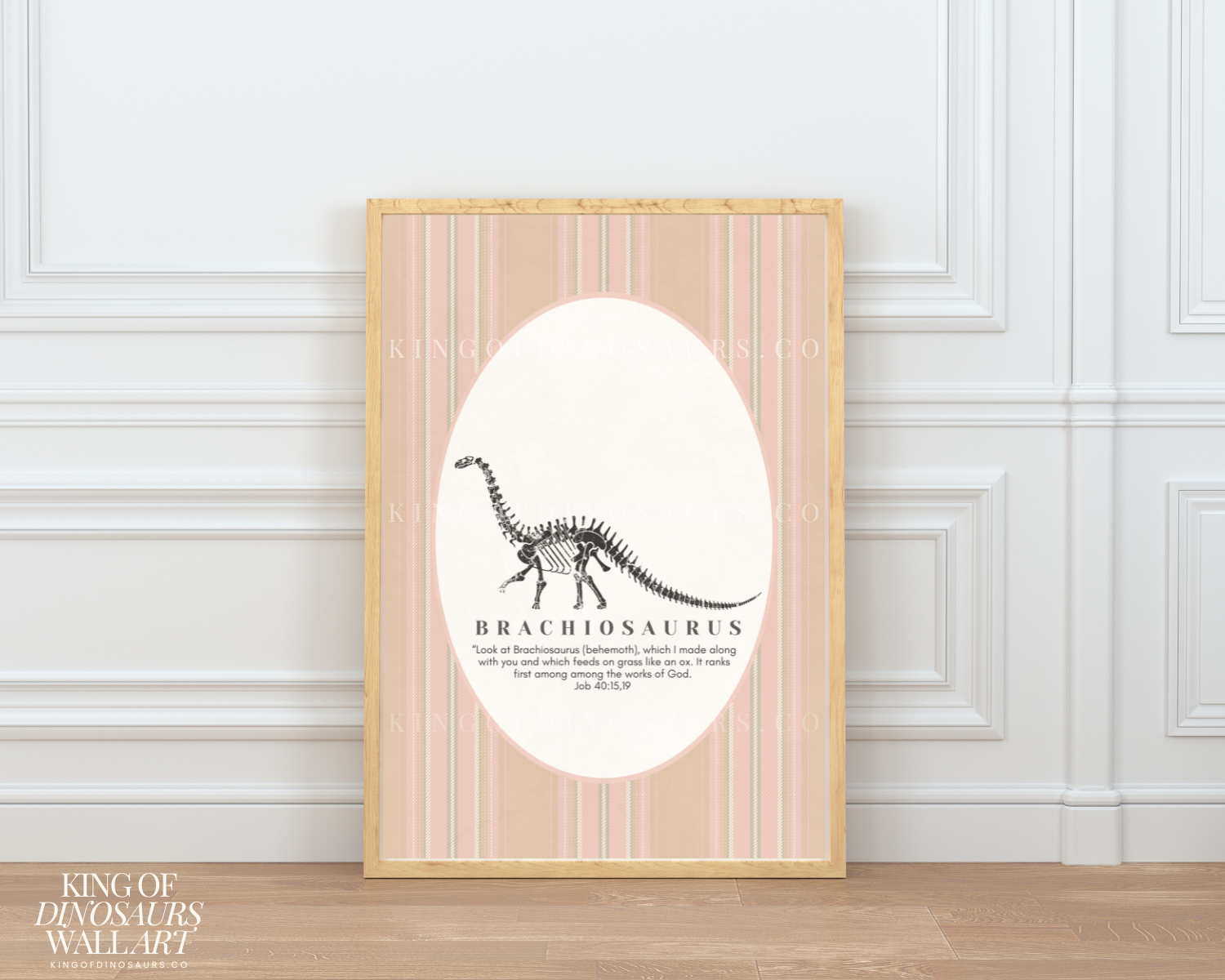 Introduce your little ones to the wonders of dinosaurs and the teachings of Jesus with our King of Dinosaurs digital art download. Perfect for parents who love Jesus and have kids who love dinosaurs, this artwork features a beautifully detailed dinosaur fossil in a vintage oval frame. The beige and ivory ticking stripe background adds a neutral touch, making it ideal for any kids’ nursery. Accompanied by a coordinating Bible verse to go with each dinosaur, this piece is a perfect blend of education and faith, helping you teach your kids about Jesus in a fun and engaging way.