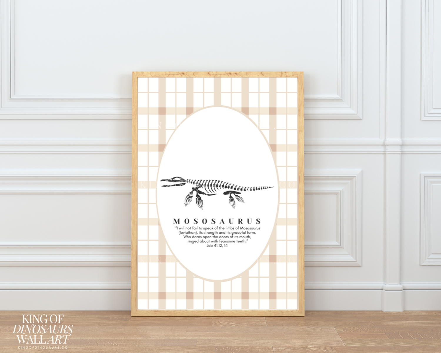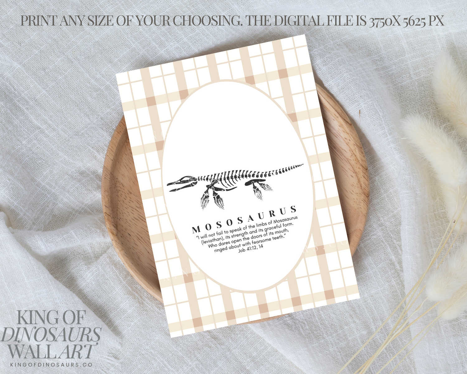 Introduce your little ones to the wonders of dinosaurs and the teachings of Jesus with our King of Dinosaurs digital art download. Perfect for parents who love Jesus and have kids who love dinosaurs, this artwork features a beautifully detailed dinosaur fossil in a vintage oval frame. The beige and ivory ticking stripe background adds a neutral touch, making it ideal for any kids’ nursery. Accompanied by a coordinating Bible verse to go with each dinosaur, this piece is a perfect blend of education and faith, helping you teach your kids about Jesus in a fun and engaging way.
