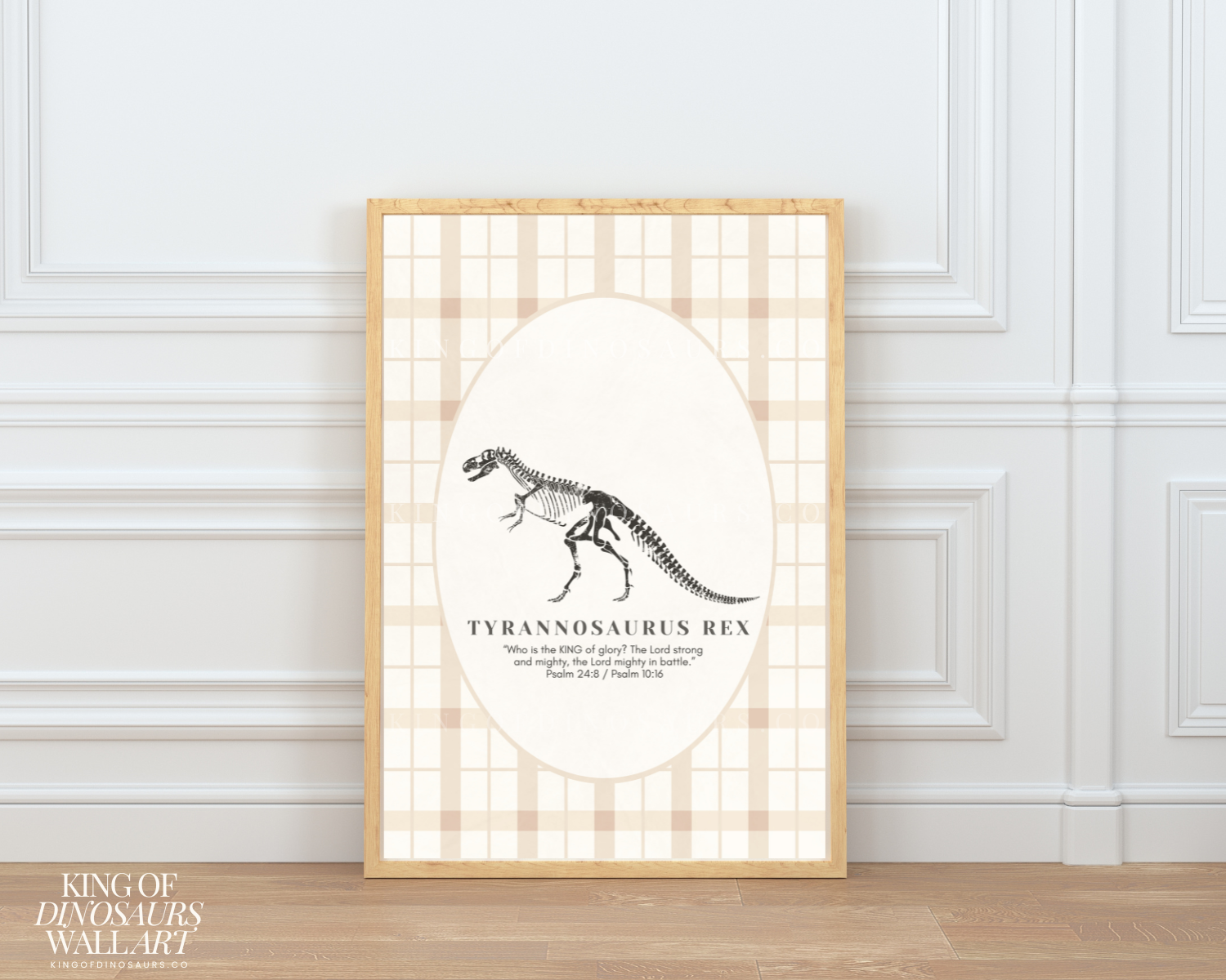 Introduce your little ones to the wonders of dinosaurs and the teachings of Jesus with our King of Dinosaurs digital art download. Perfect for parents who love Jesus and have kids who love dinosaurs, this artwork features a beautifully detailed dinosaur fossil in a vintage oval frame. The beige and ivory ticking stripe background adds a neutral touch, making it ideal for any kids’ nursery. Accompanied by a coordinating Bible verse to go with each dinosaur, this piece is a perfect blend of education and faith, helping you teach your kids about Jesus in a fun and engaging way.