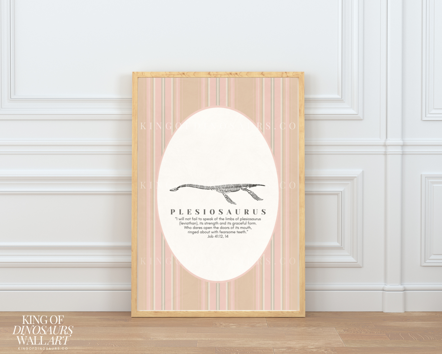 Introduce your little ones to the wonders of dinosaurs and the teachings of Jesus with our King of Dinosaurs digital art download. Perfect for parents who love Jesus and have kids who love dinosaurs, this artwork features a beautifully detailed dinosaur fossil in a vintage oval frame. The beige and ivory ticking stripe background adds a neutral touch, making it ideal for any kids’ nursery. Accompanied by a coordinating Bible verse to go with each dinosaur, this piece is a perfect blend of education and faith, helping you teach your kids about Jesus in a fun and engaging way.