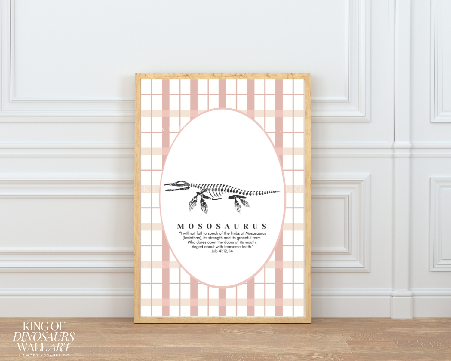 Introduce your little ones to the wonders of dinosaurs and the teachings of Jesus with our King of Dinosaurs digital art download. Perfect for parents who love Jesus and have kids who love dinosaurs, this artwork features a beautifully detailed dinosaur fossil in a vintage oval frame. The beige and ivory ticking stripe background adds a neutral touch, making it ideal for any kids’ nursery. Accompanied by a coordinating Bible verse to go with each dinosaur, this piece is a perfect blend of education and faith, helping you teach your kids about Jesus in a fun and engaging way.