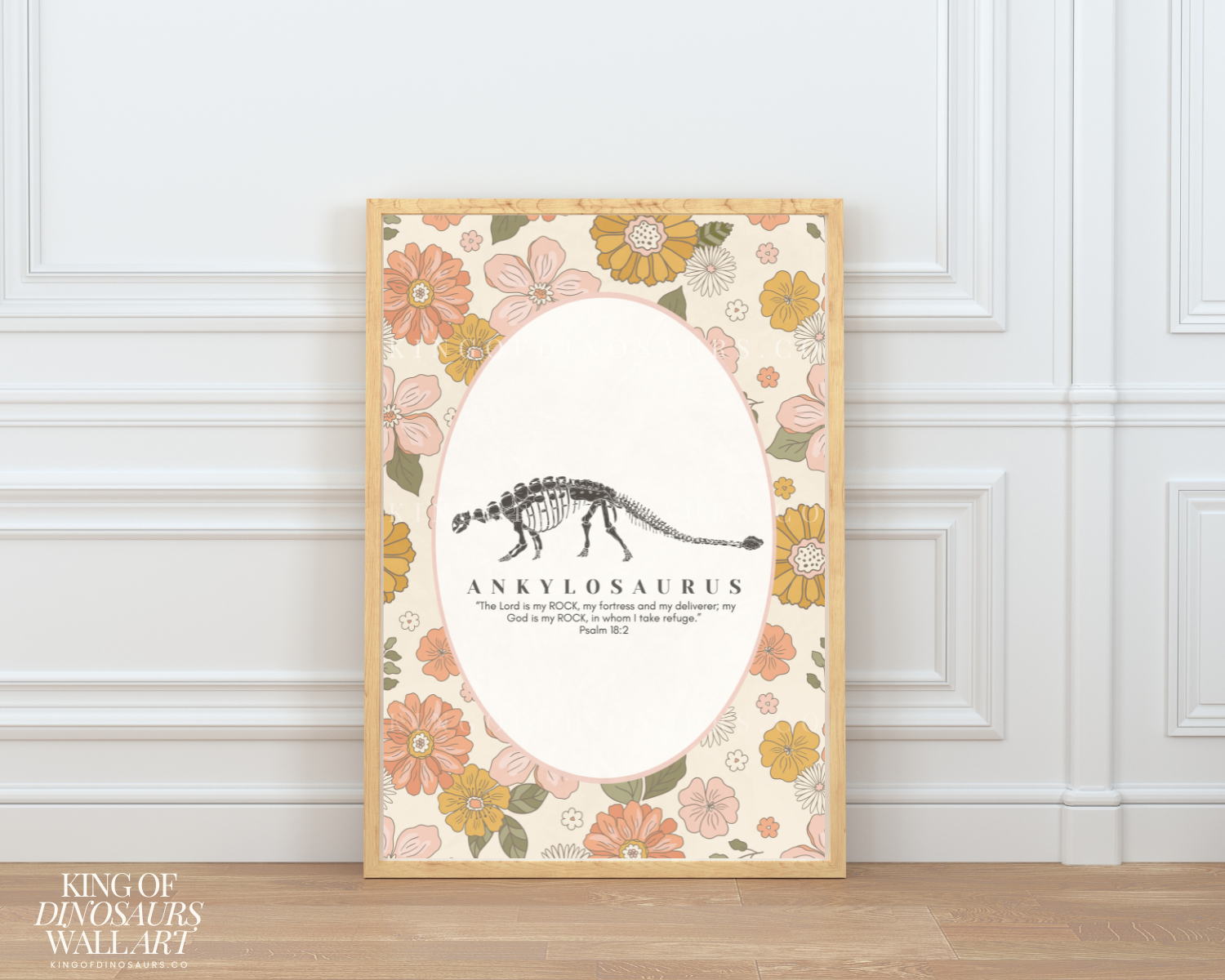 Introduce your little ones to the wonders of dinosaurs and the teachings of Jesus with our King of Dinosaurs digital art download. Perfect for parents who love Jesus with kids who love dinosaurs, this artwork features a beautifully detailed dinosaur fossil in a vintage oval frame. The beige and ivory ticking stripe background adds a neutral touch, making it ideal for any kids’ nursery. Accompanied by a coordinating Bible verse to go with each dinosaur, this piece is a perfect blend of education and faith, helping you teach your kids about Jesus in a fun and engaging way.
