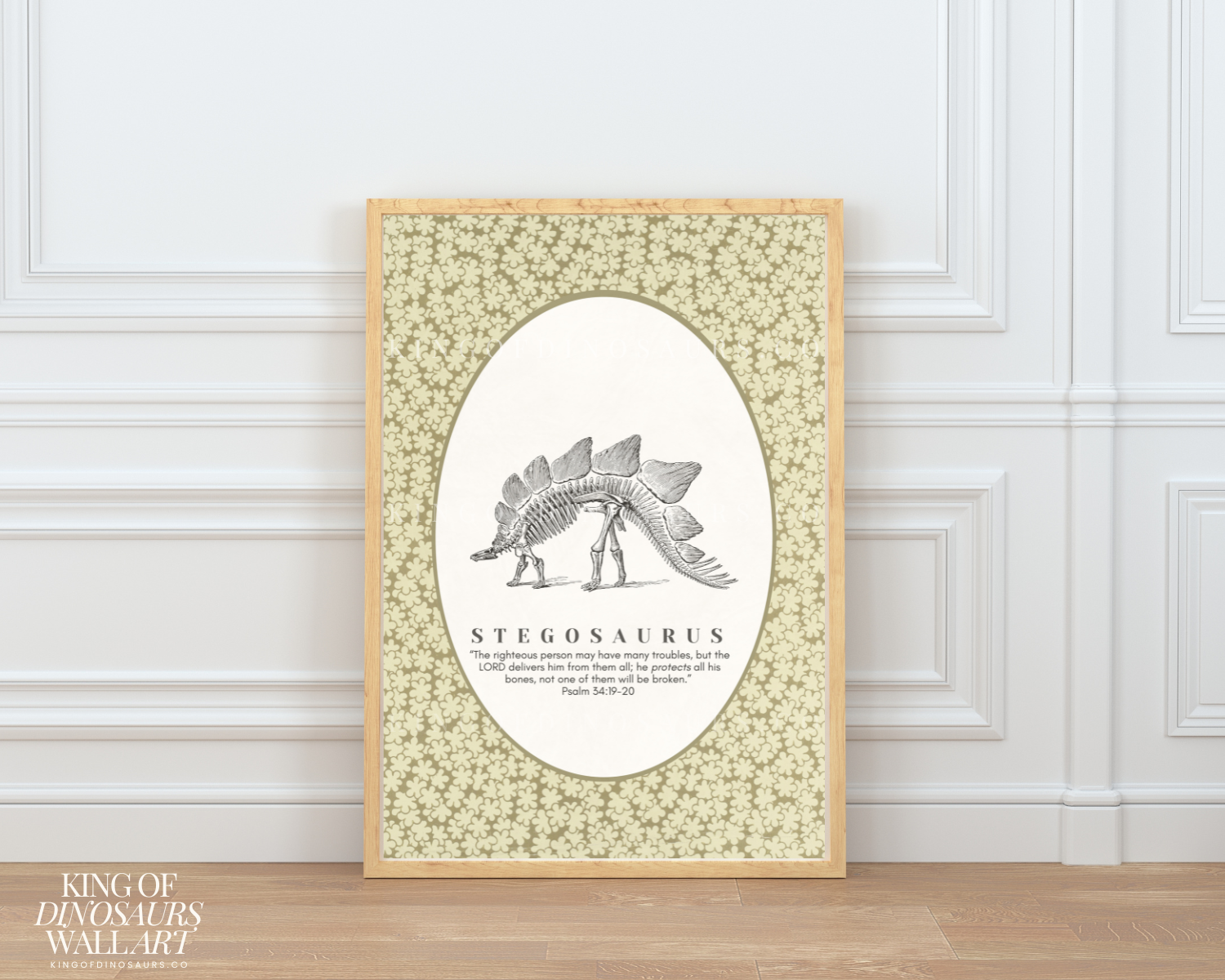 Introduce your little ones to the wonders of dinosaurs and the teachings of Jesus with our King of Dinosaurs digital art download. Perfect for parents who love Jesus and have kids who love dinosaurs, this artwork features a beautifully detailed dinosaur fossil in a vintage oval frame. The beige and ivory ticking stripe background adds a neutral touch, making it ideal for any kids’ nursery. Accompanied by a coordinating Bible verse to go with each dinosaur, this piece is a perfect blend of education and faith, helping you teach your kids about Jesus in a fun and engaging way.